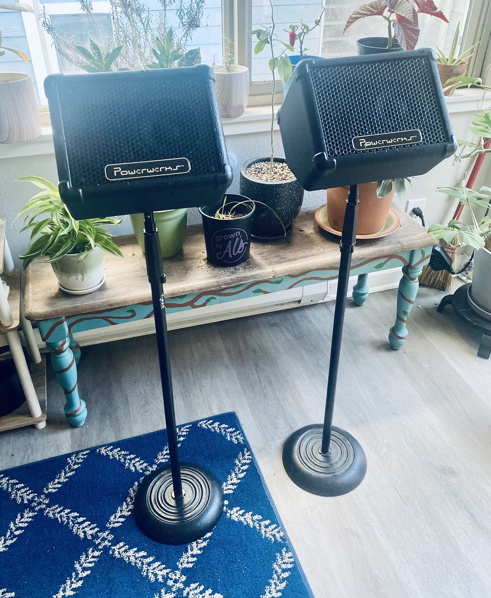 Two Powerwerks PW4P model powered monitors with adjustable stands. Each speaker is 50 watts. Please ask me about other musical equipment that I am selling.