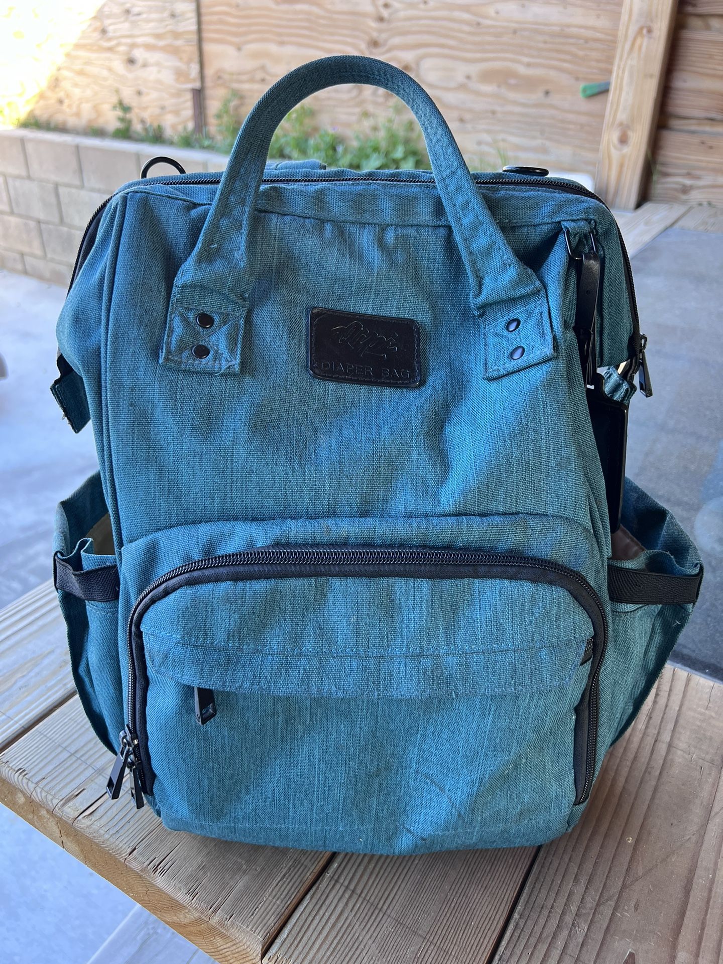Teal Diaper bag great condition, can be hung from a stroller with loops attatched. Backpack straps as well as strap for attaching to suitcase handle. Front zipper has insulated compartments for bottles. Lots of room and pockets.