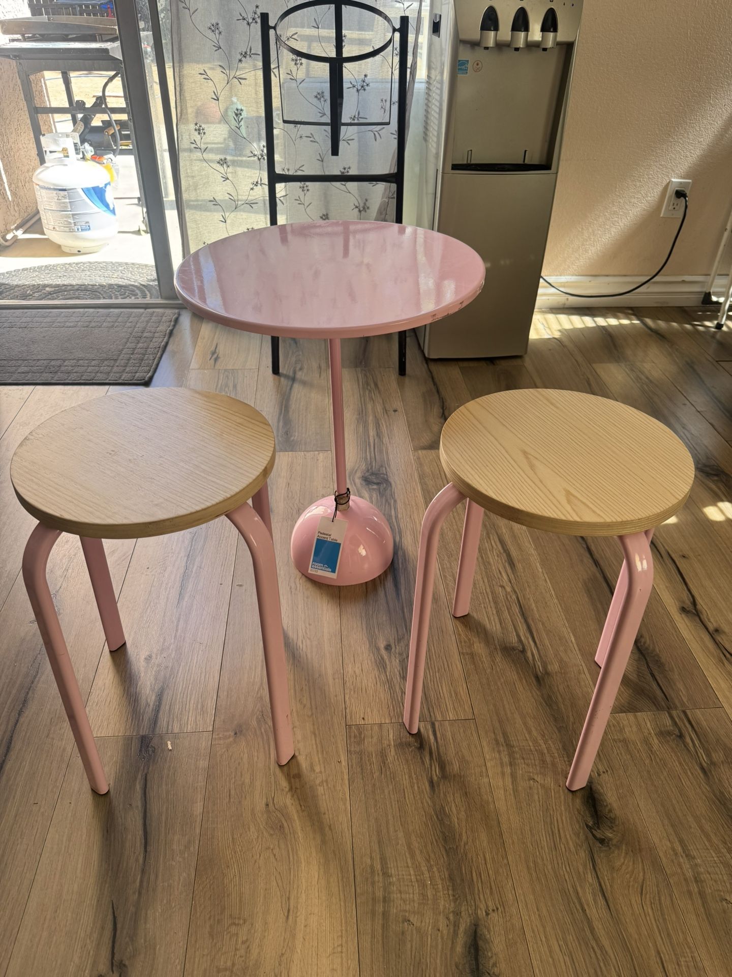 Great for kids or adults Small size 2 stools and one pedestal table Brand new Some damage on table and scratches