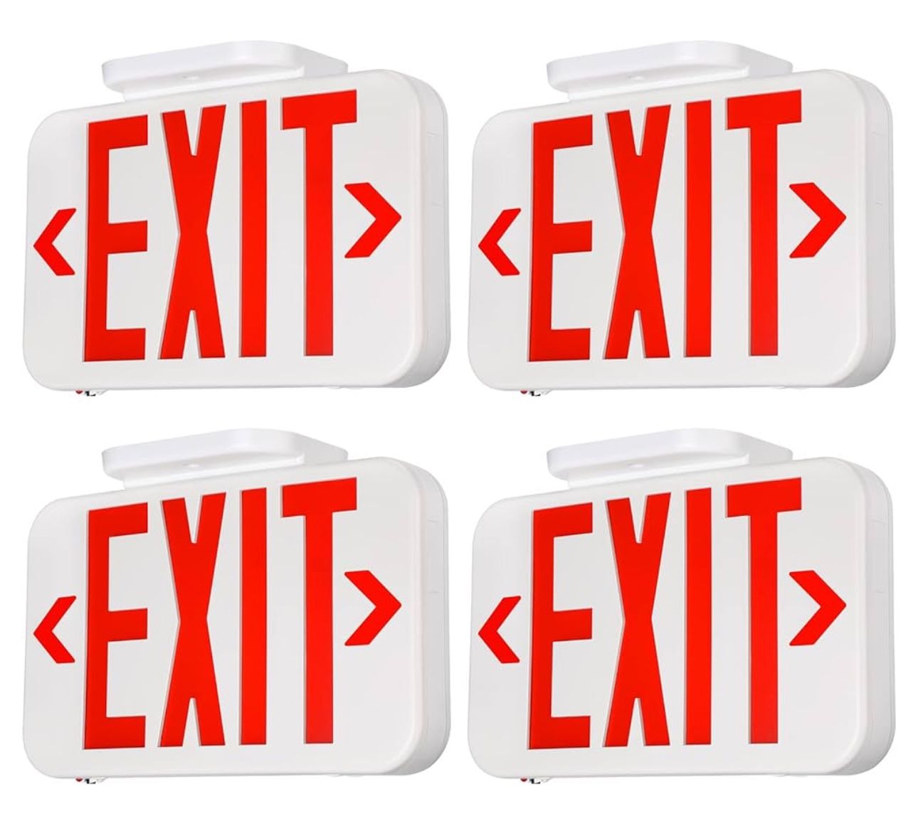 TORCHSTAR LED Double Face Emergency Exit Sign Lights with Battery Backup (Set of 4) * Safety Guaranteed: Made of fireproof ABS plastic, 45mm thickness has good fire resistance, corrosion resistance and durability, not easy to damage and suitable for damp locaiton. The appearance is round and the four corners are upgraded to a curved angle, which can reduce the collision damage caused by the emergency * Triple Mounting: Three mounting options are available for our emergency exit light: side wall mounting, ceiling mounting, and back wall mounting. All mountings and accessories are in the package * Durable Backup: With a built-in 1.2V 900mAh rechargeable battery, the red letter led exit light can work continuously up to 90 minutes during power outages after full-charged, providing indication lighting for emergency situations * Wide Voltage: 120V or 277V circuit for use at home, commercial and industrial lighting. The emergency exit lighting is suitable for doorways, office, apartments, warehouse, supermarkets, schools, etc * Multiple Application: This double face Led exit sign is bulit with two directions of arrows on each side for flexible installation * * Brand : TORCHSTAR * Color : Red * Material : Acrylonitrile Butadiene Styrene * Mounting Type : Wall Mount * Light Type : LED * Hardware Included