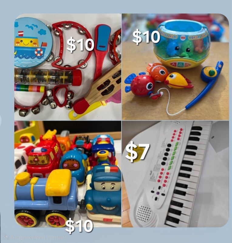 Assorted kids toys including musical instruments, toy cars, fishing toy set, and a small keyboard. Used but in good condition. Fun toys for toddlers and young kids.