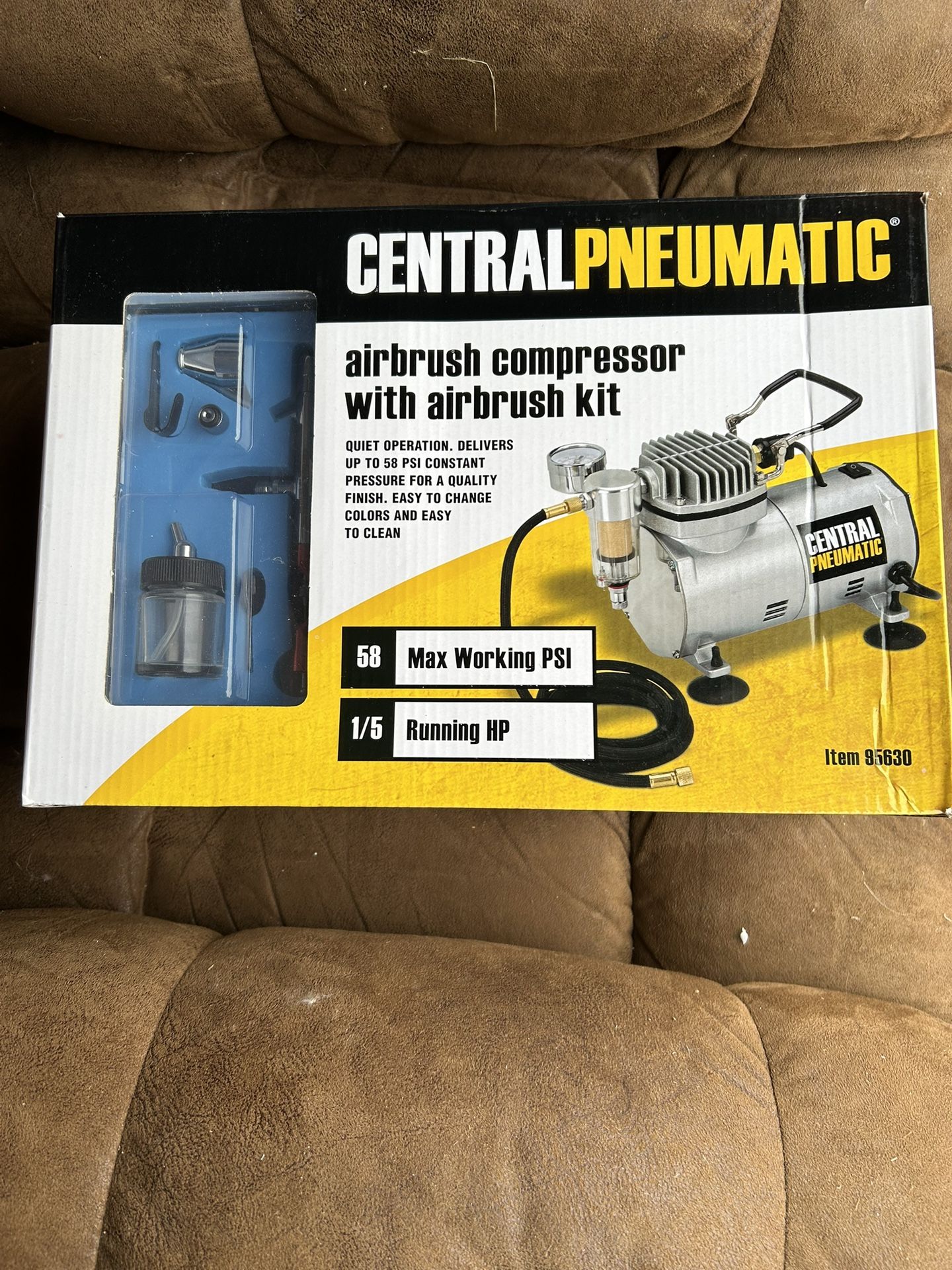 Brand new Central Pneumatic airbrush compressor with airbrush kit AND Pashe airbrush kit with a couple pieces missing. See other items and more coming.