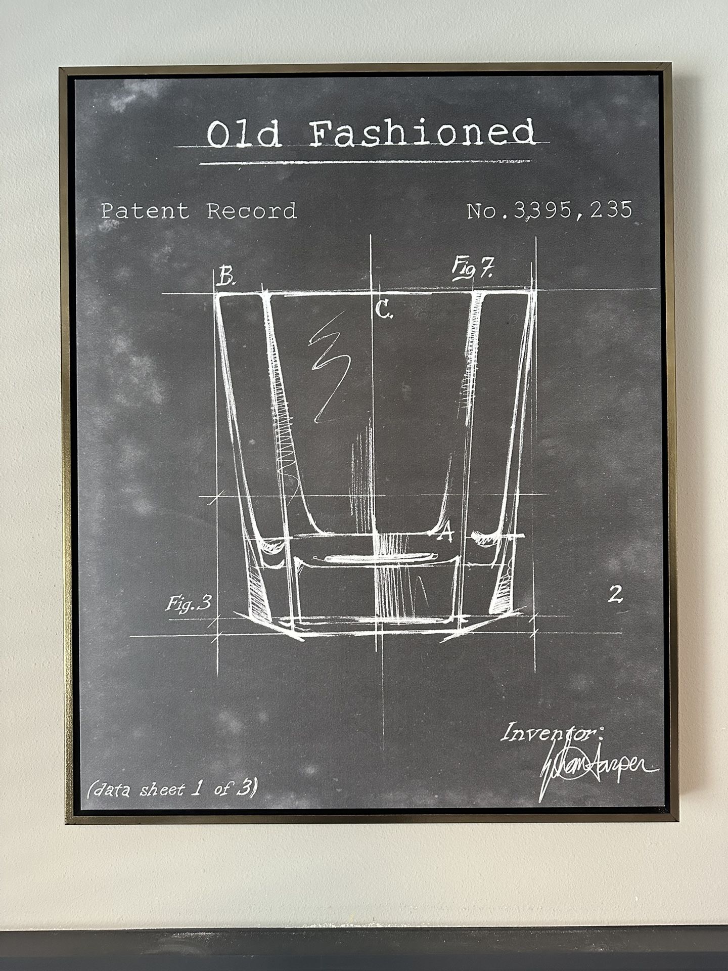 Originally purchased from https://offerup.co/faYXKzQFnY?$deeplink_path=/redirect/ for $305. This is a framed canvas Old Fashioned blueprint. Without frame, the canvas is 24in x 30in. With the frame, 25.5in x 31.25in. Selling both pieces together. The frame is painted gold around the front edges with black wood siding. Minor chipping of the gold paint.