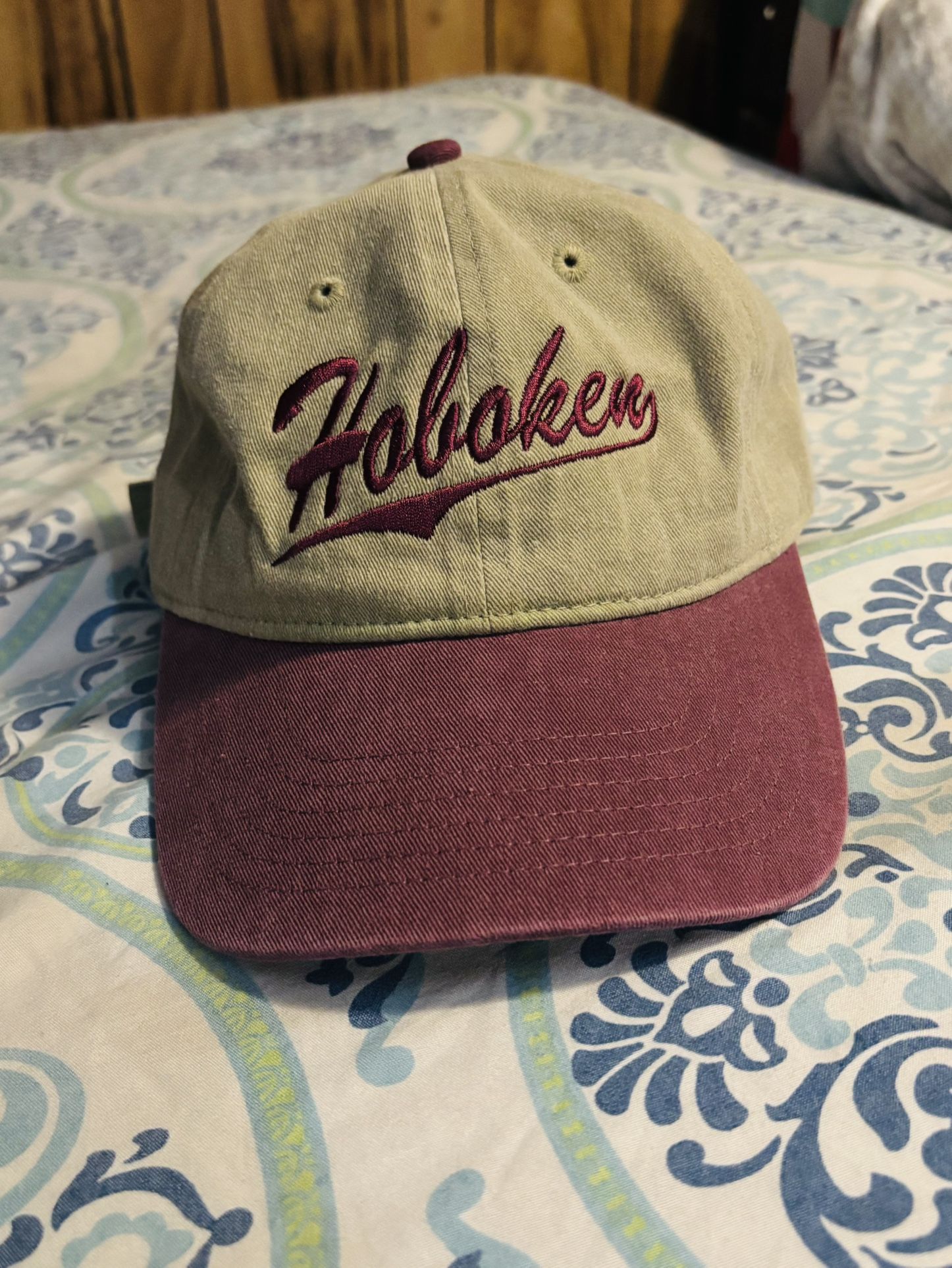 Stylish Hoboken baseball cap featuring a tan crown with embroidered burgundy lettering and a matching burgundy brim. Made from durable cotton with breathable eyelets for all-day comfort. Includes an adjustable back strap to fit most head sizes. Clean, casual design—perfect for everyday wear.