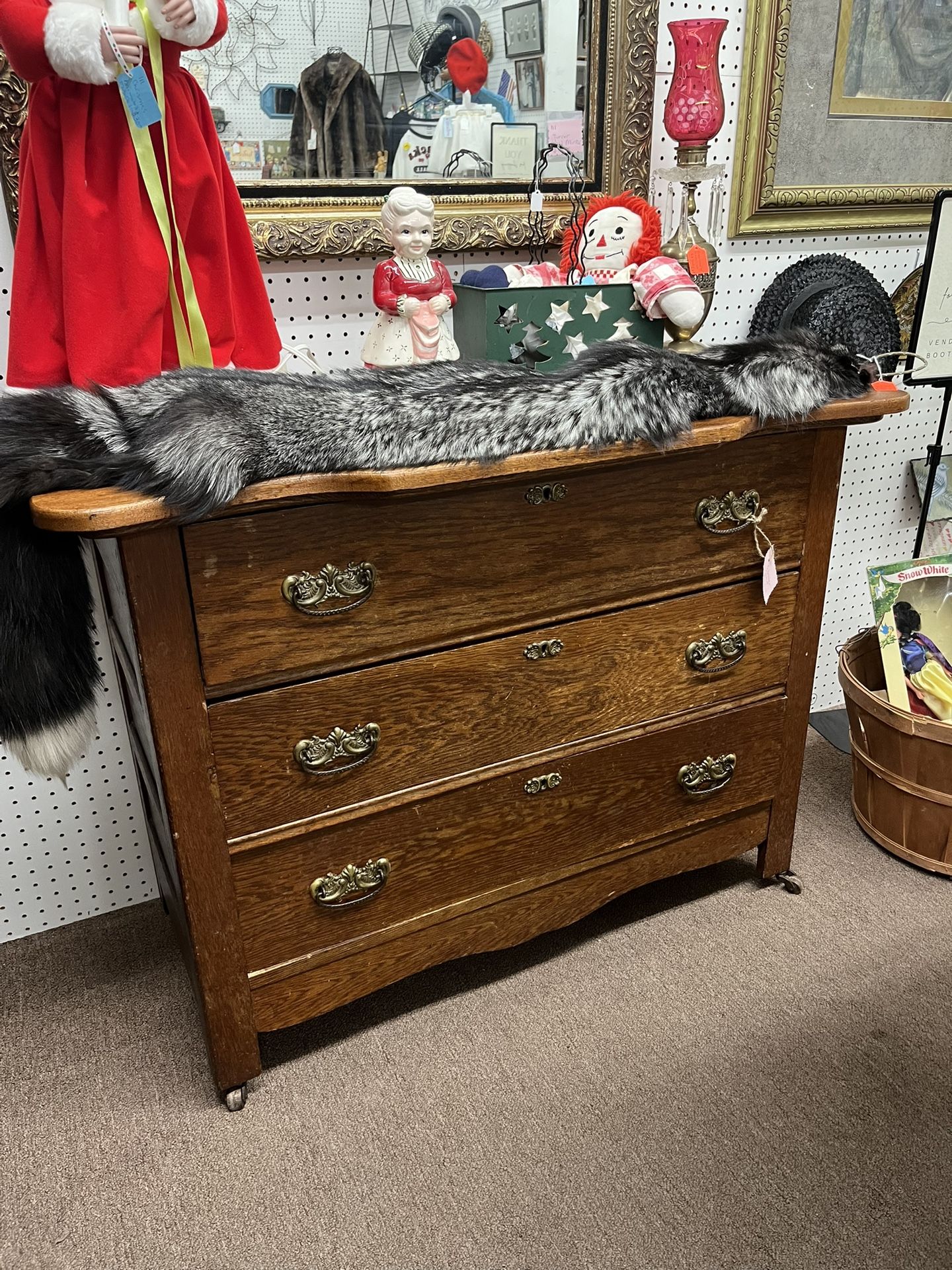 3 drawer wood dresser on wheels. This can be found in booth B3. See photos for location and other info. Measures about: 42” wide, 20” deep, and 32” tall