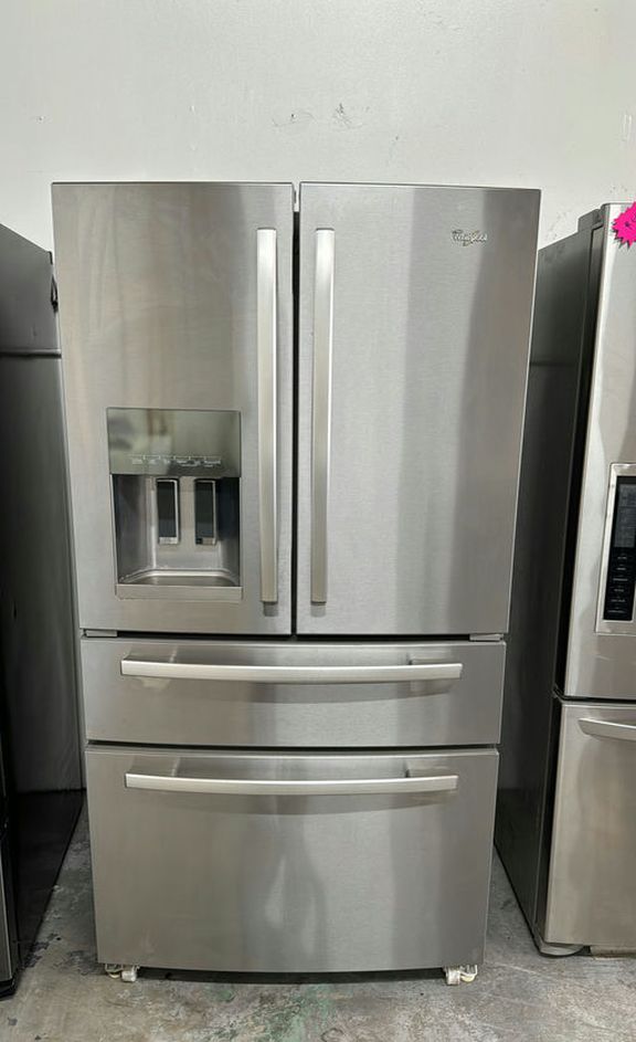 Enjoy fresh, filtered water on demand and bright LED lighting with this Whirlpool 4-Door Refrigerator. The French door design and spacious drawer freezer make it perfect for families and entertainers alike. \n\nYou’ll find the exterior in great shape with only minor scuffs from gentle use. All shelves, drawers, handles, and the control panel are clean and fully functional. \n\nComes with 60-day warranty \n\nSame day delivery available \n\nDM / Message us for more info\n\nHablamos español