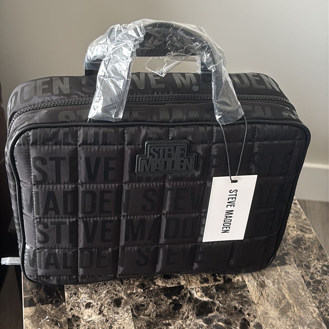 Brand new Steve Madden quilted travel cosmetic bag in black with all-over Steve Madden logo design. Still has the original tag and plastic on the handles. This stylish bag opens flat and has two large zip compartments, making it perfect for organizing makeup, toiletries, skincare, travel items, or electronics accessories. Features: • Brand: Steve Madden • Color: Black with embossed logo pattern • Condition: Brand new with tags • Dual zip compartments for easy organization • Opens flat for full visibility • Quilted padded exterior • Top carry handle Great for travel, gym, overnight bags, or everyday organization. Clean, unused, and ready to go. Pickup in Spartanburg. Cash preferred.