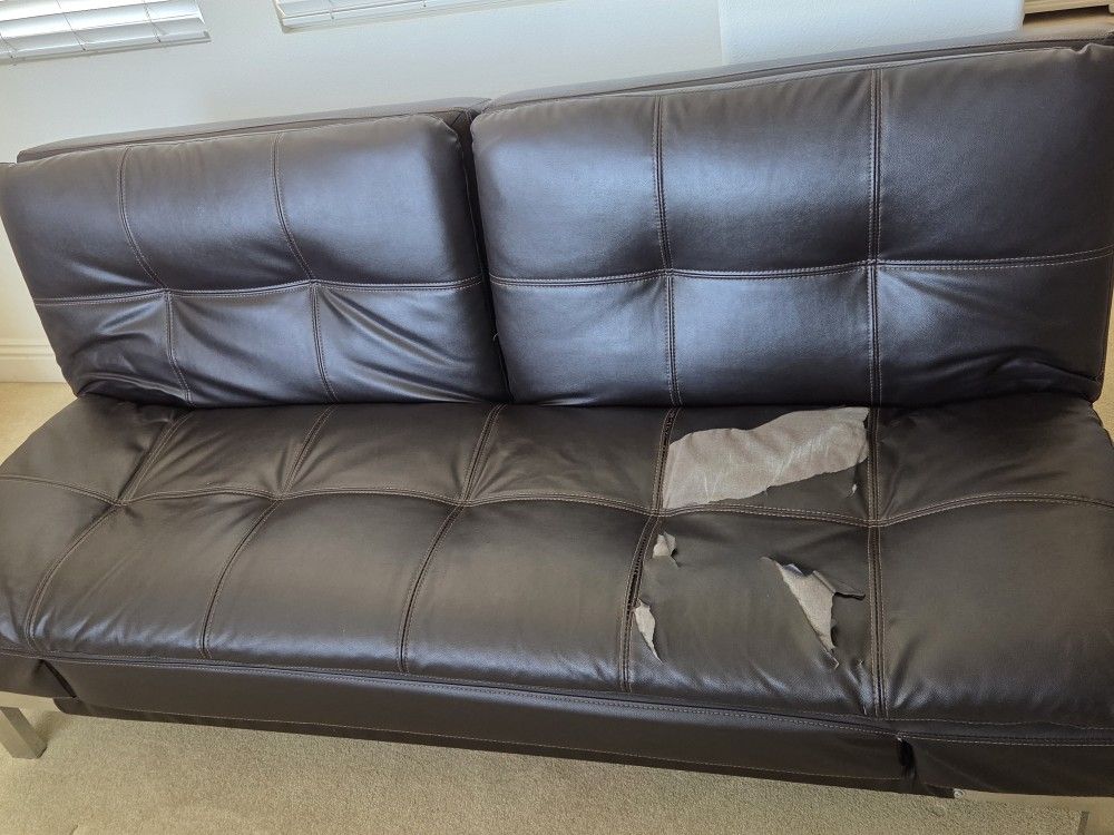 Costco futon, steel frame.used in loft area. Only one side peeled, which can be patched. Still have lots of life. Can be used as day bed.