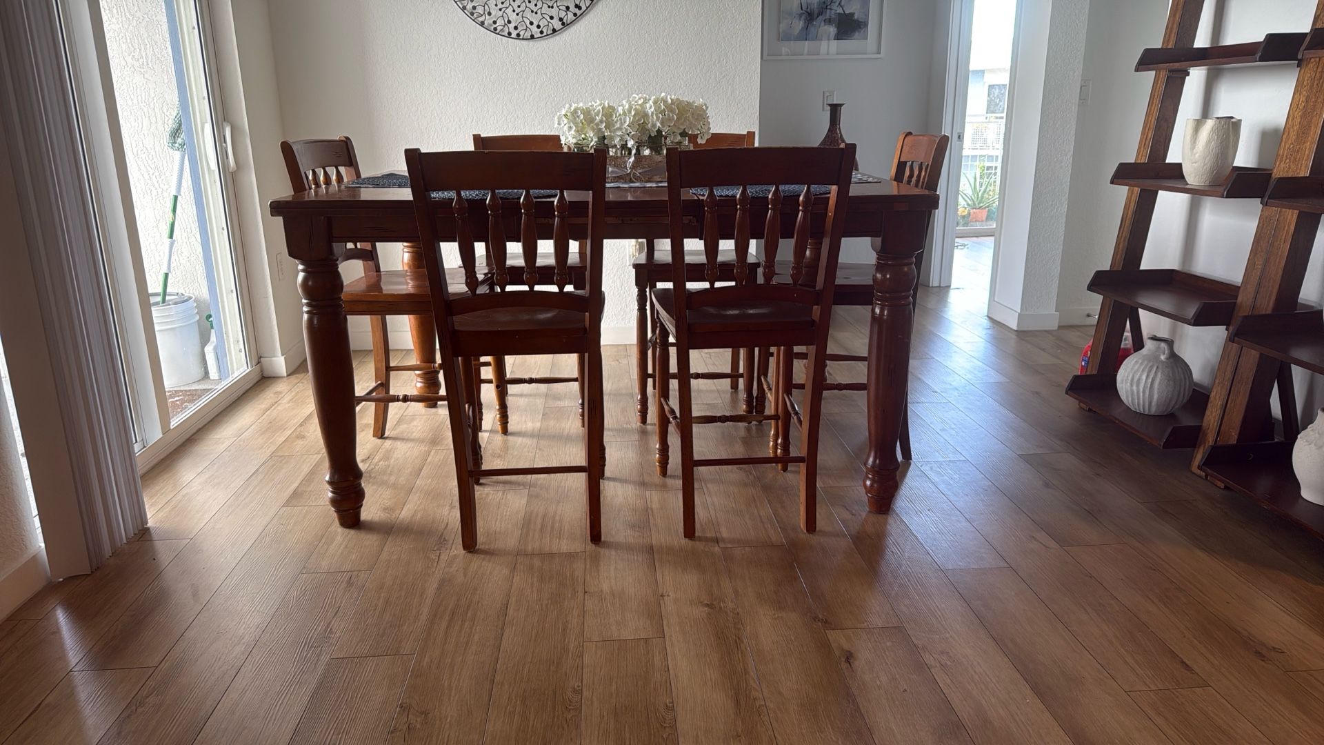 For sale: solid wood dining set in dark mahogany color, includes rectangular extendable table and 6 chairs. The table features turned legs and a classic design that brings warmth to any home. 🔹 The set shows signs of wear and use (scratches and stains), but it is structurally strong and sturdy. 🔹 Perfect to use as is or as a refinishing/restoration project. Table dimensions: • Length: 89” • Width: 67” • Height: 36” 💲 Price: $180 BO 📍 Location: Pompano Beach 🚗 Local pick-up only Comedor de madera maciza extensible con 6 sillas. 89” L × 67” A × 36” H. Firme, con desgaste visible. Patas torneadas, estilo clásico y robusto. Presenta marcas de uso/desgaste (arañazos y manchas), pero está firme y resistente. Ideal para usar tal cual o como proyecto de restauración.