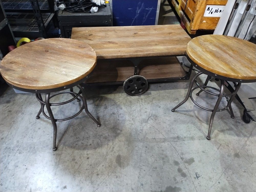 Industrial wood and metal coffee table and end tables. The coffee table has wheels for easy movability. Measurements shown. No broken pieces