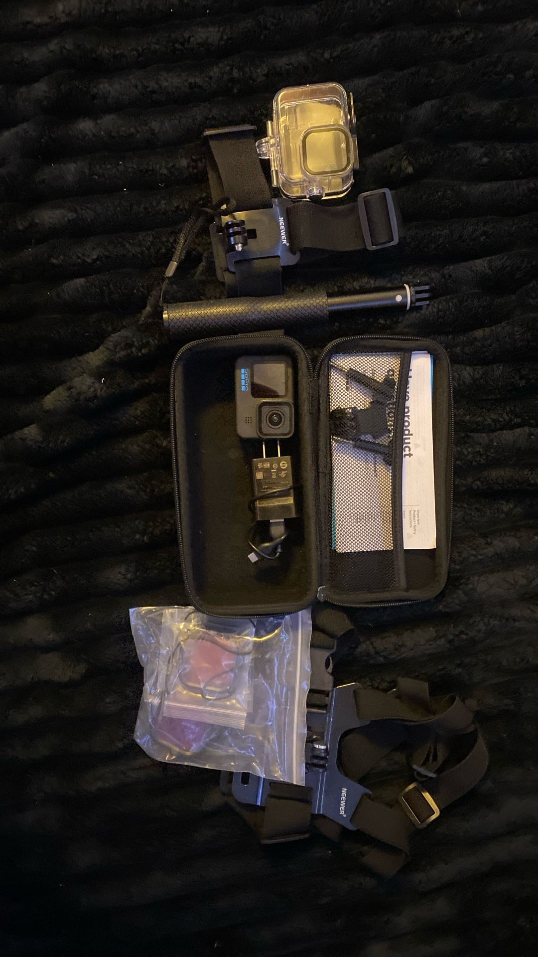 in amazing condition, no cracks or anything . Comes with head strap, chest strap, waterproof case, charger and selfie stick.