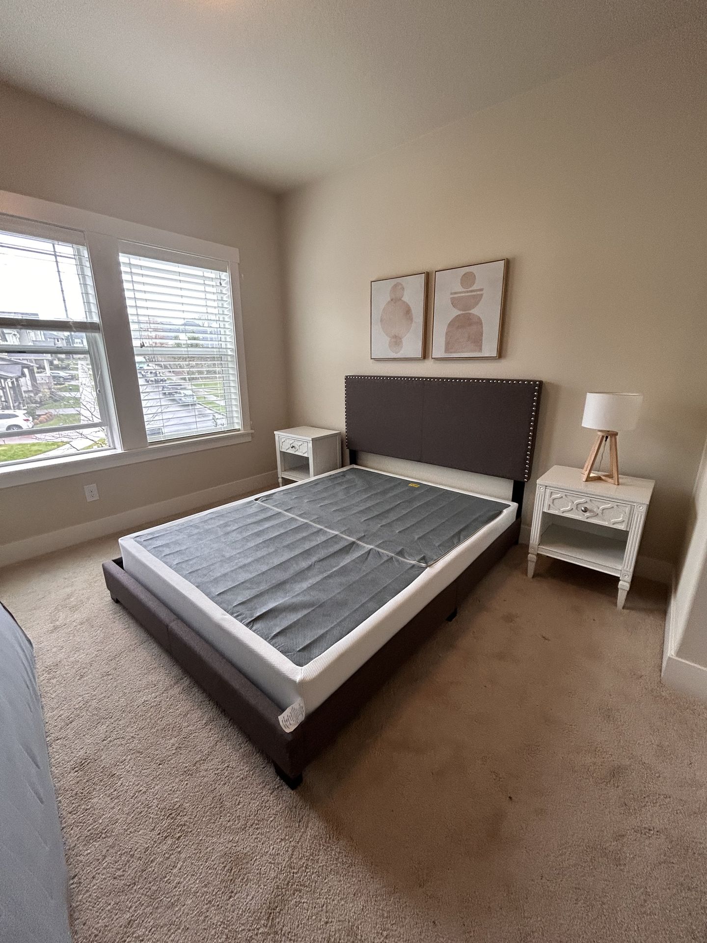 Queen bed frame ( dark grey fabric with studs) with wooden plank base. Measurements: H:45”, W:64”, L:84” Good conditions. Used only as guest bed. Scratches on bottom right ( cat), however not visible when bed is dressed. Zinus bi-fold box spring queen size 7.5”. 2 x wooden nightstands with drawer. Measurements:H:25”, W:20”, D:15”. In good conditions. Slight wear and tear ( they were repainted). No visible damage. Sold as lot. Pick up in South Beaverton. Accept serious offers. Must be picked up, no deliveries, sorry!