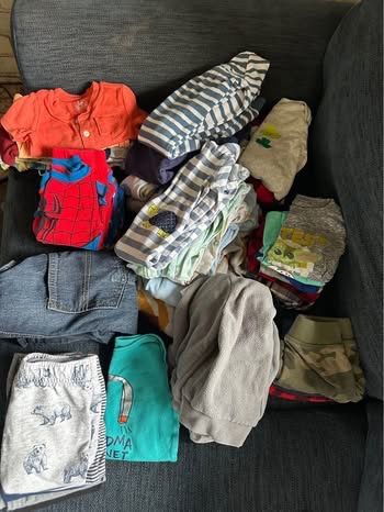 10- sleepers 4- long sleeve onesies 1- pair of overalls 3- zip up jackets 6- pairs of pants 3- pairs of shorts 6- shirts 3- pj sets 9- onesies 1- swim set 1- set I have other sizes too (in different posts). Willing to bundle for less!