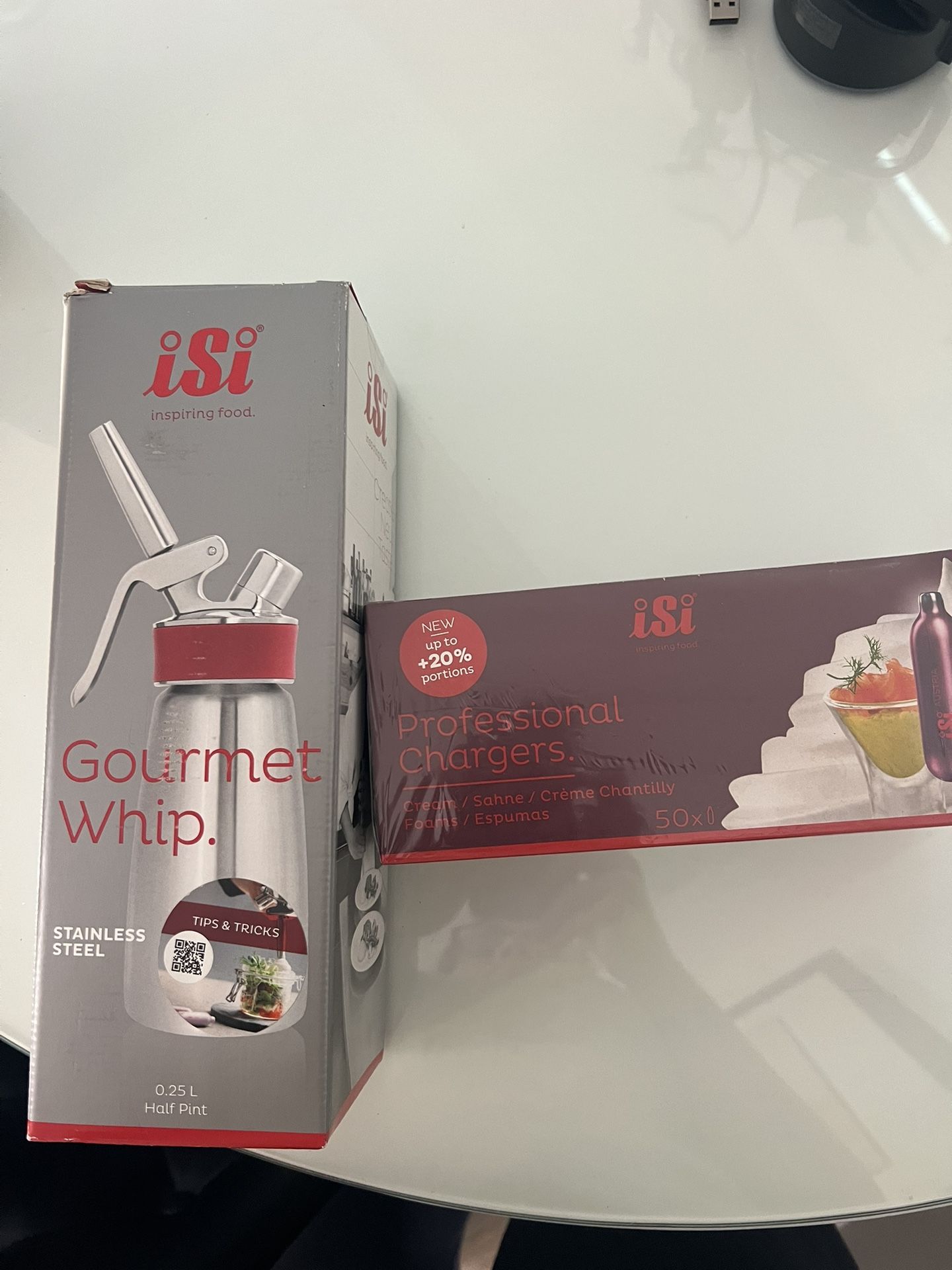 ISI Gourmet Whip .25 L (half pint) and 50 professional chargers. Both boxes new, never used, never opened