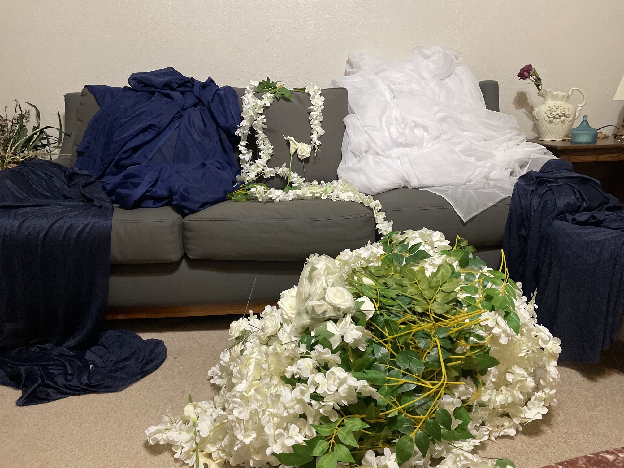 Assortment of white, beige, and navy blue wedding decorations: Calla Real-touch fake lily flowers for bouquet or centerpieces 3.6 feet Wisteria Vine Ratta hanging artificial flowers Floroom Foam Ivory, Champagne, and Navy blue roses 10ft & 14ft Ling’s Moment sheer Ivory Light Gold and Navy Blue chiffon for table runner or decor