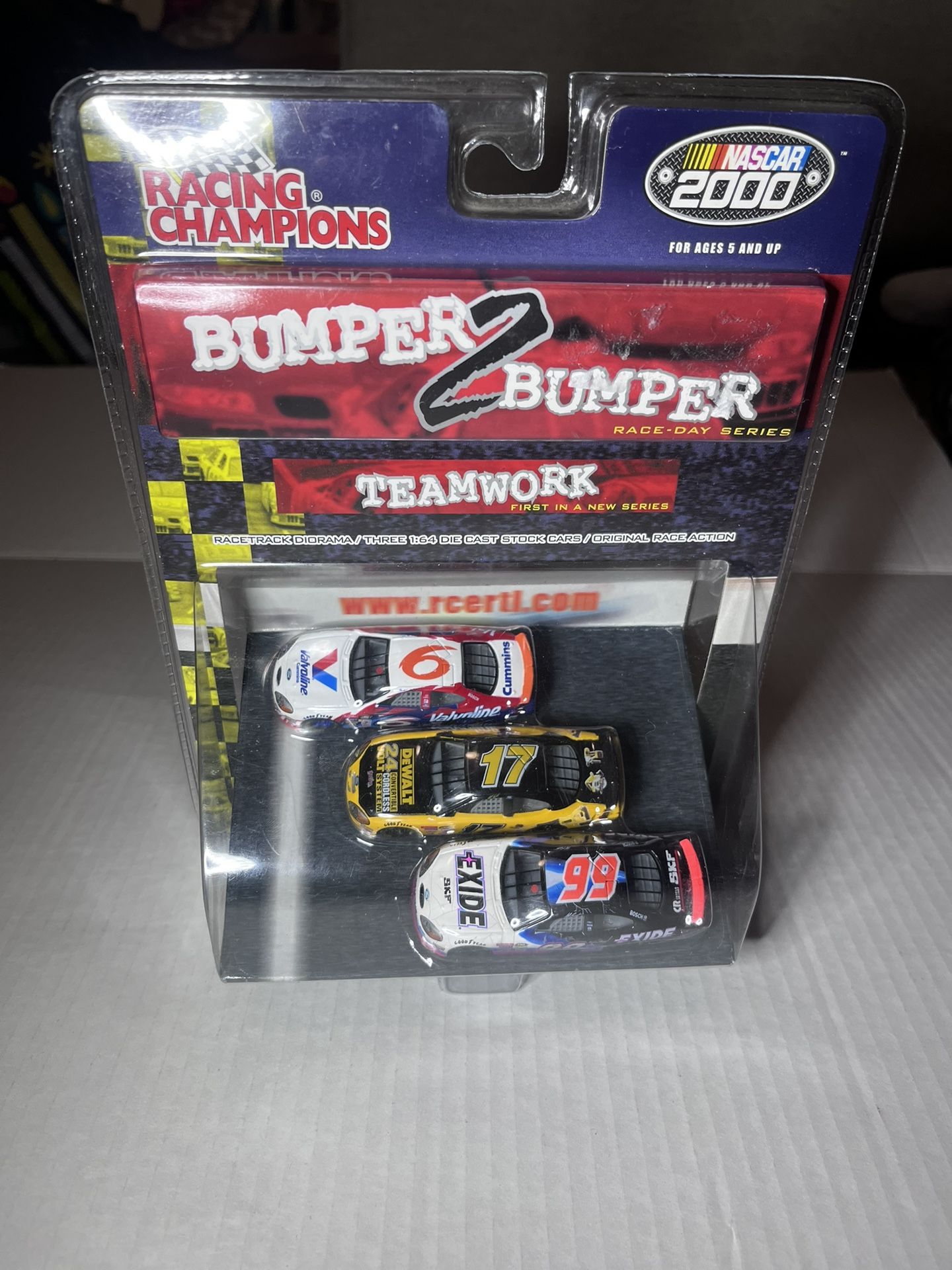Description: Racing Champions NASCAR 2000 “Bumper 2 Bumper – Teamwork” set. Includes three 1:64 scale diecast stock cars. Factory sealed in original packaging. Great for collectors or display.