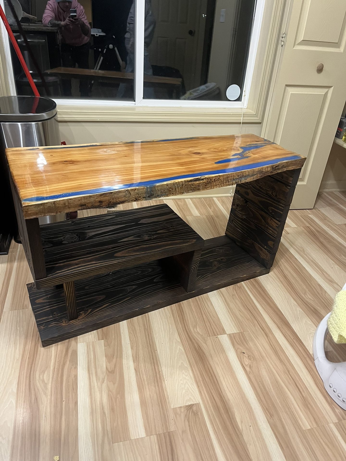 Beautiful and sturdy hand built to last live edge epoxy topped entertainment stand! Makes any room look great and will be an attention getter without a doubt! Custom woodwork design that’s conditioned and stained and then finally finished with a gloss lacquer! Message me for any questions