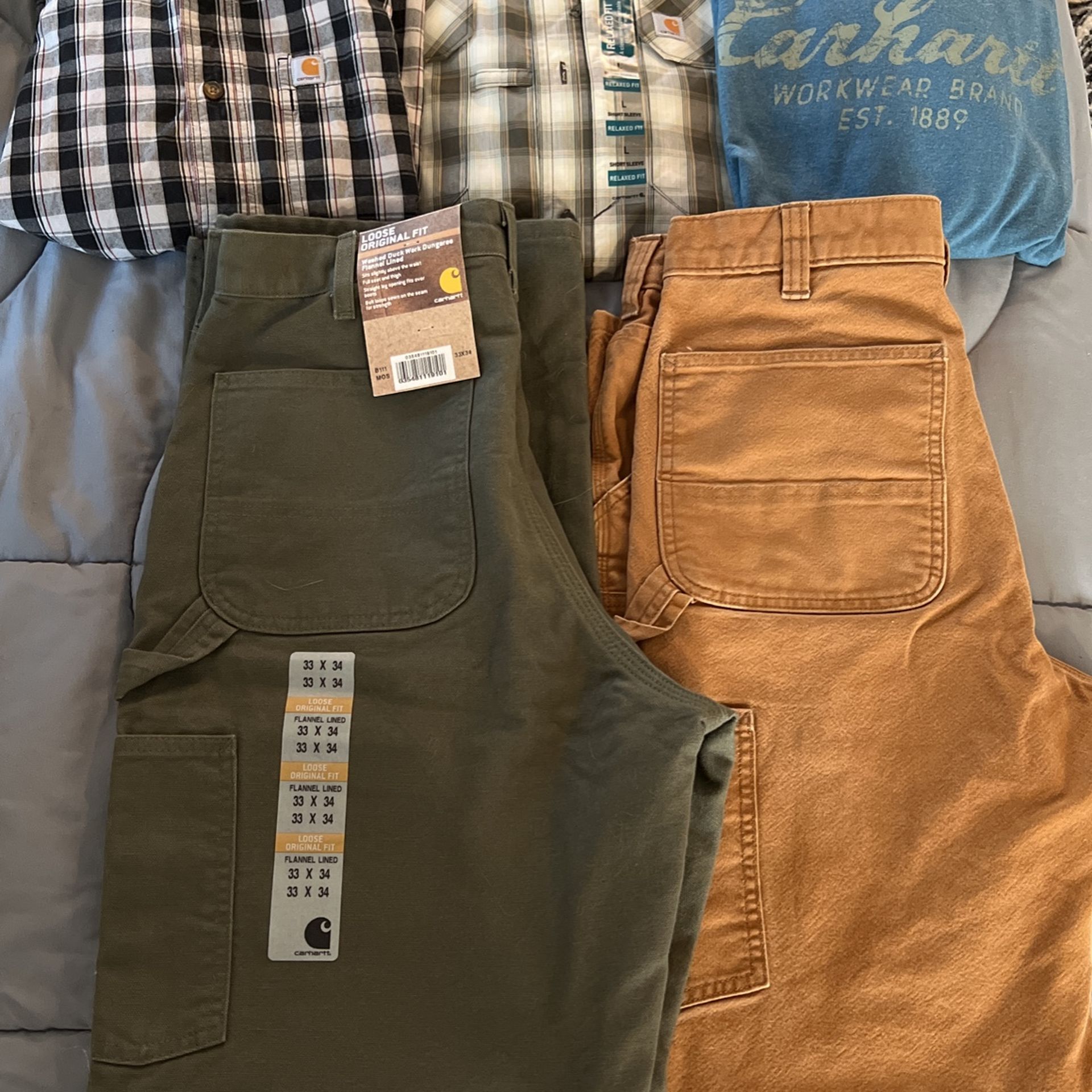 2 Large Plaid Short Sleeve Relaxed Fit Button Ups. (1 Brand New With Tags. Other one worn twice) 1 Medium Long Sleeve Shirt. 1 33X34 Loose Original Fit Flannel Lined Duck Work Dungarees. (Brand New with Tags) 1 33 X 34 Relaxed Fit