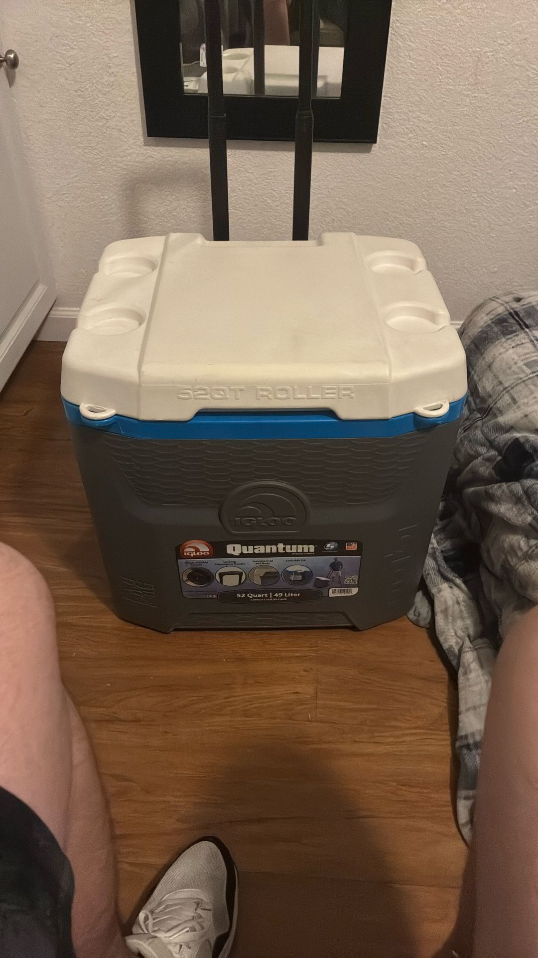 52 quart/49 liter cooler can hold 85 cans. It has wheels and handles for easy carrying plus tie areas to keep it closed. It is brand new we needed it for a camping trip that never ended up happening.