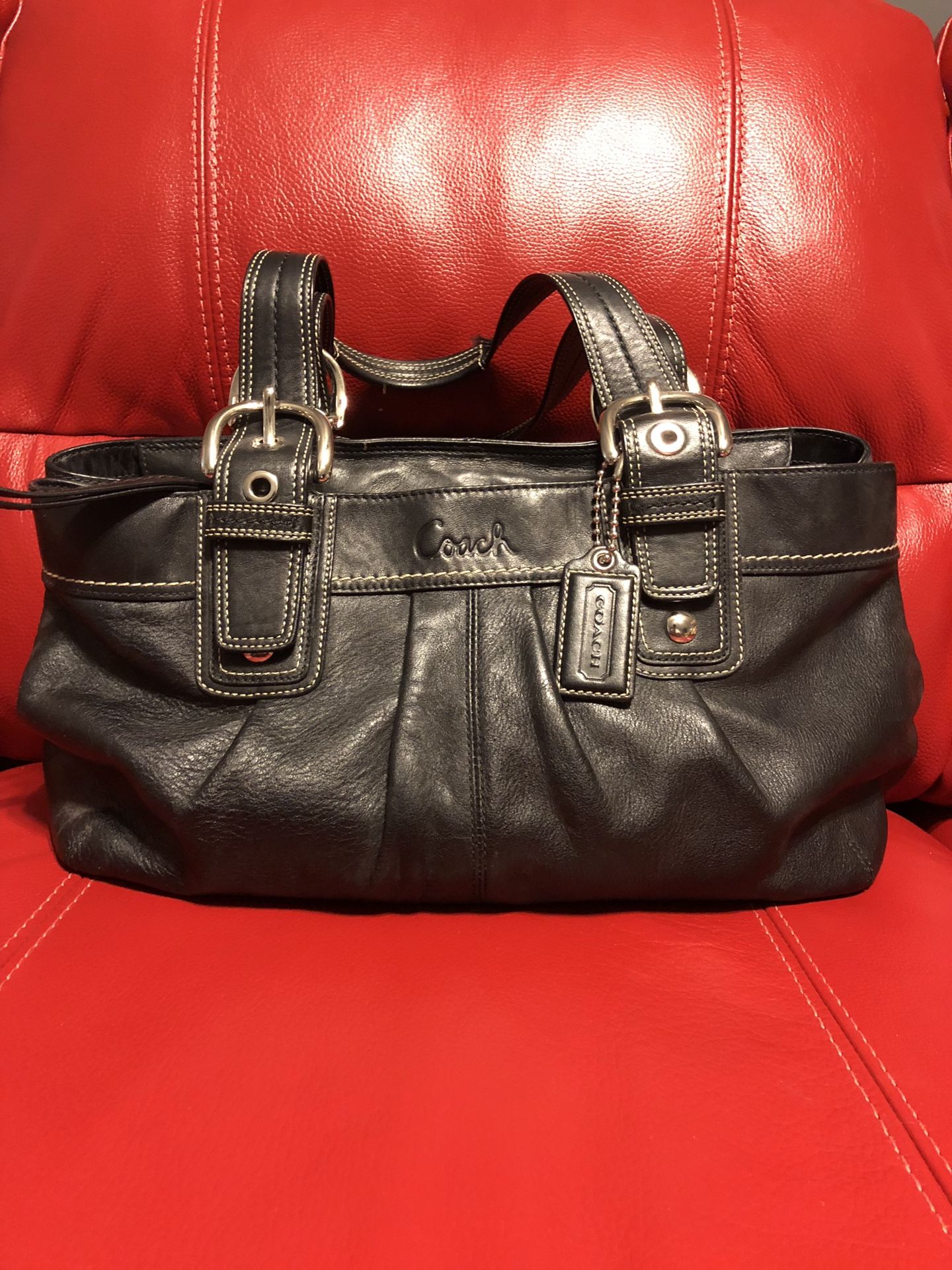 Purse is an authentic Coach purse. Black leather exterior, grey interior. There is an interior zipper pocket, and two slip pockets. Excellent condition! Can verify authenticity.
