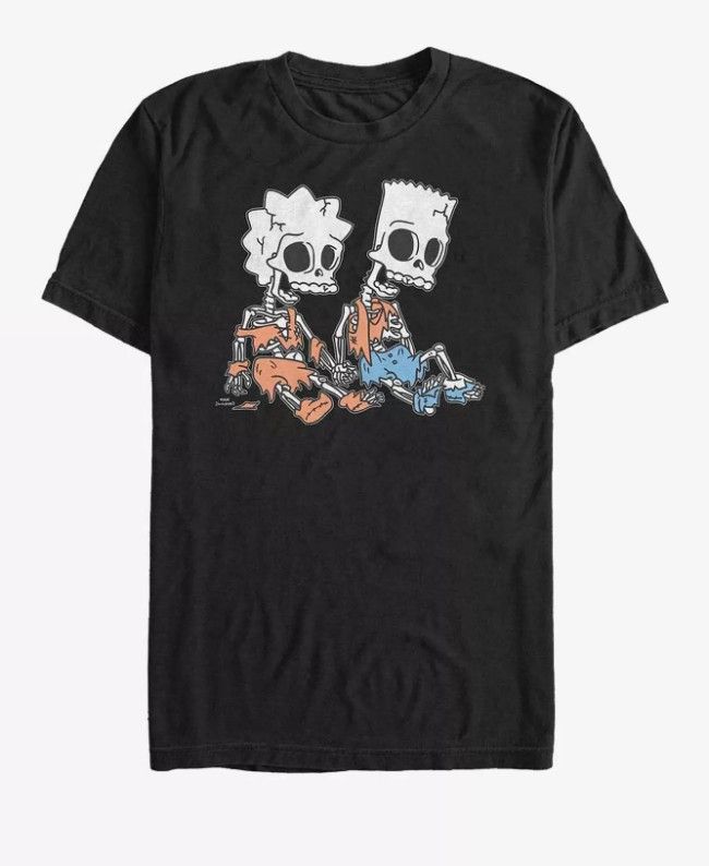 This graphic T-shirt features Bart and Lisa Simpson as skeletons, inspired by the iconic "Treehouse of Horror" Halloween specials from The Simpsons. The T-shirt comes in black and features a crew neckline and short sleeves. The design shows the skeletal versions of the siblings sitting together in their signature tattered clothing. Made of 100% cotton. Pre-owned, no rips or tears. Size XL. Price: $9.99 Pick up in Chula Vista. Cash only.