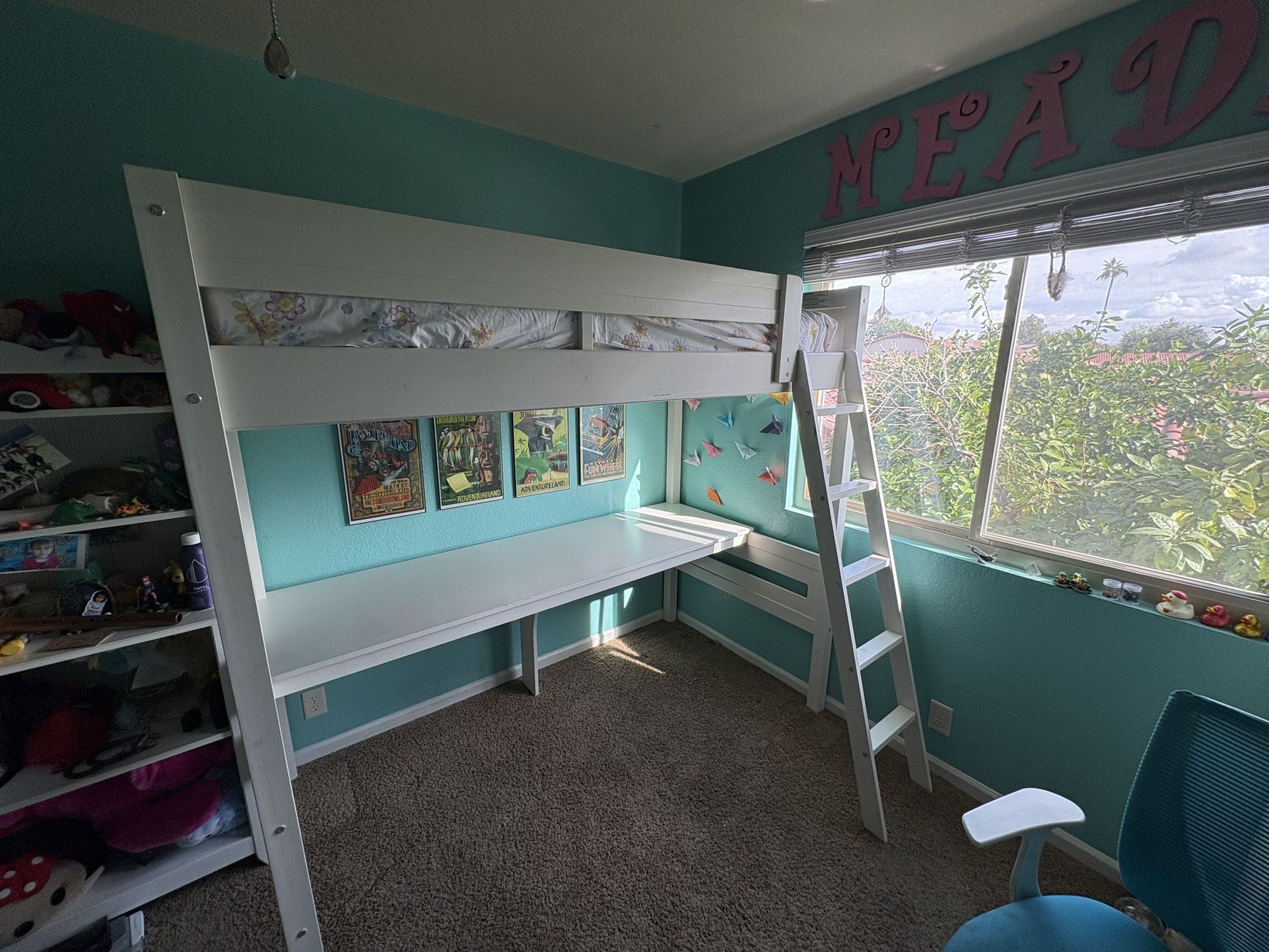 Twin size loft bed with integrated desk underneath. Mattress and access ladder included.