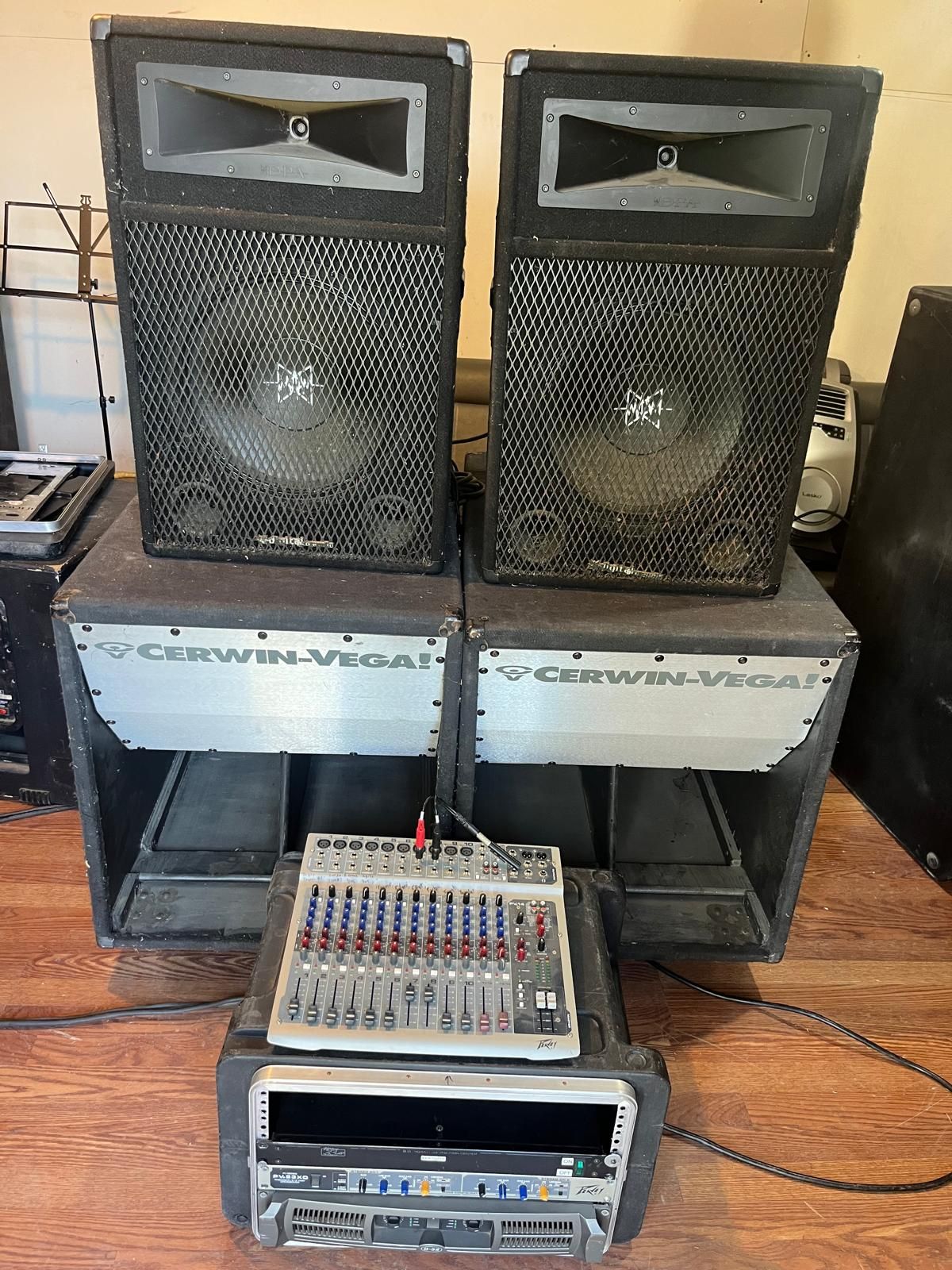 2 speakers, 1 power amp 4000 whatts 1 crossover pv 1 mixer 12 Chanels pv Used. Good working conditions. Good for dj or band