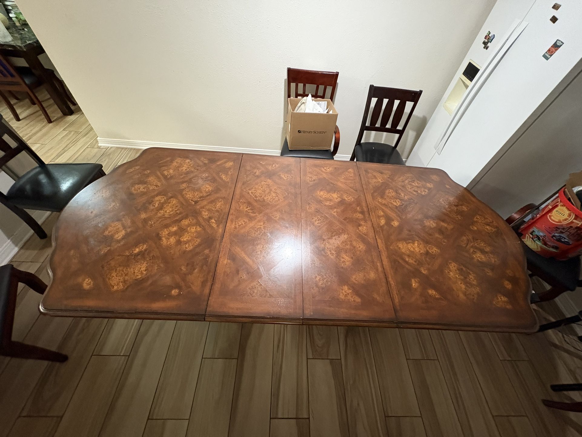 Minor wear, fully functional, can be shortened by removing middle, very heavy. 500 obo Chairs are not included as they are not matching chairs nor are they meet the same quality as the table. Length: 102 inches (8ft 6in) Width: 45 inches (3ft 9in)