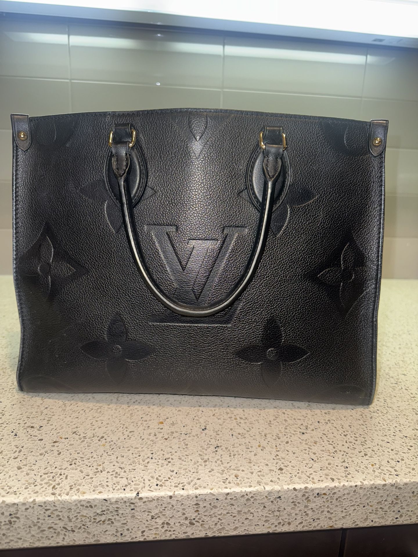 Louis Vuitton OnTheGo GM in sleek black Monogram Empreinte leather. This is the largest size tote – structured, spacious, and perfect for everyday use or travel. Crossbody or Top Handle. 👜 Measurements: • Length: 16.1 in • Height: 13.4 in • Width: 7.5 in • Handle drop: 5.5 in • Shoulder strap drop: 11.4 in 🖤 Features: • Embossed monogram Empreinte leather • Gold-tone hardware • Double handles + long straps • Secure hook closure • Interior zip + flat pockets • Made in France stamp • Includes LV monogram zipper pull + hook ✨ Condition: • Exterior: Great condition – leather looks strong, minor edge wear, but no major flaws • Interior: Suede lining shows visible stains/wear throughout (pictured) mostly make up, professional cleaning might get everything off • Hardware works perfectly • No odors, no rips Bag comes as is. 🔥 Retails over $3,500 – grab a deal on a real LV