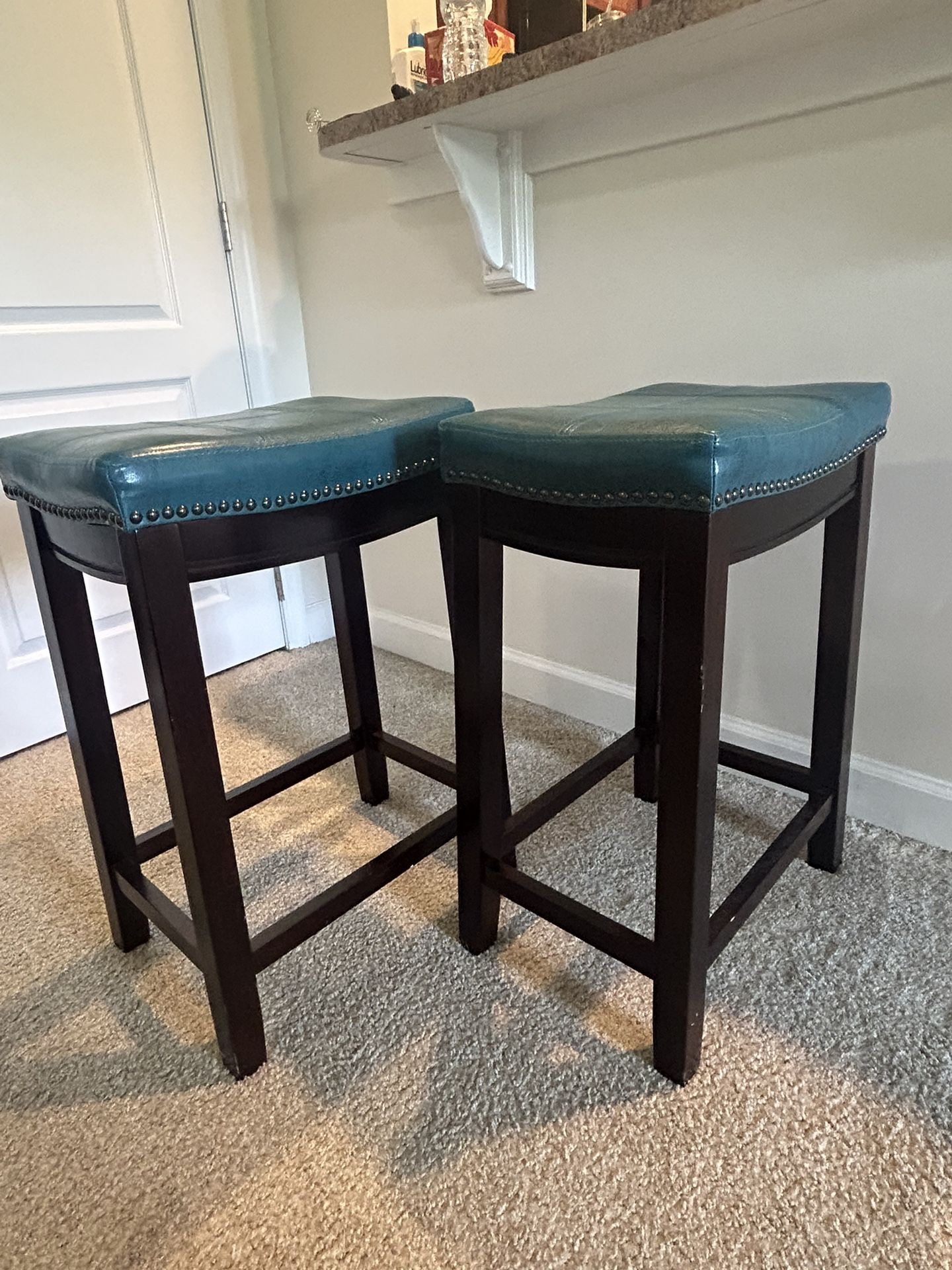 Teal faux leather and wood bar stools