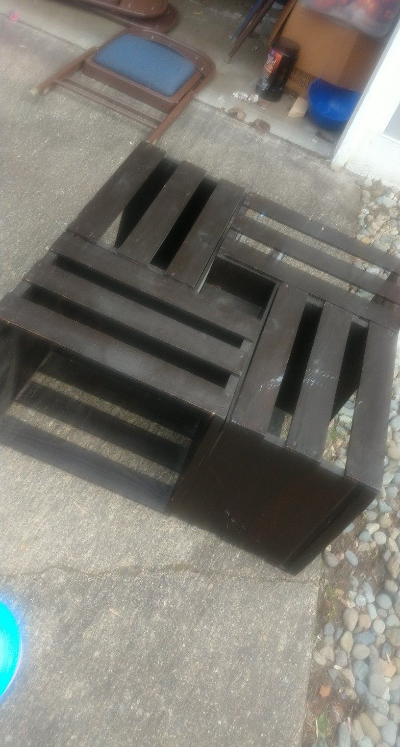 Custom made coffee table. Made out of r pallet crates. Just needs a wipe down can be used as a coffee/end table in living room or can tip on to side and makes a nice shelf table.