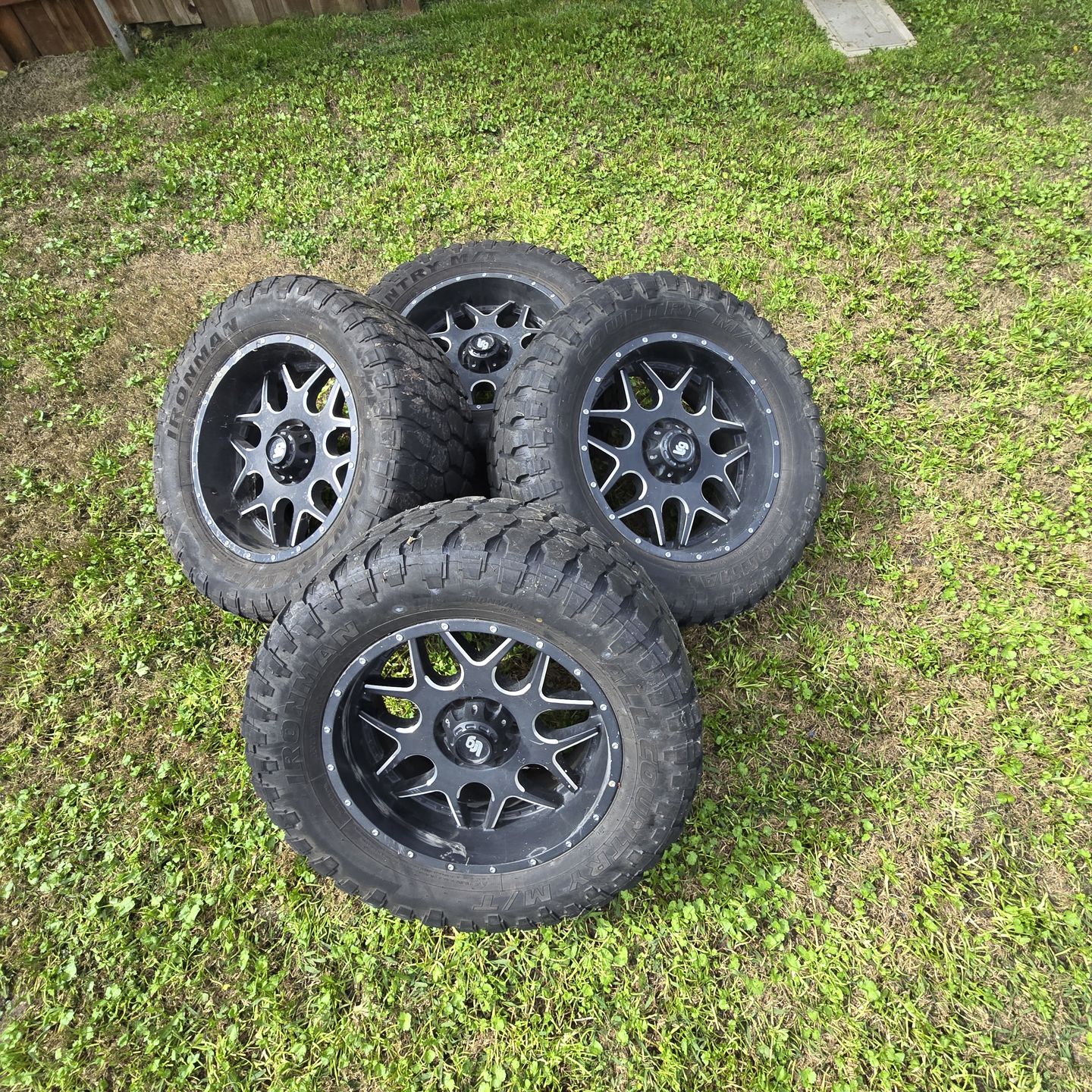 Set of 4 Black lrg rims with tires 6 lug Came off a lifted chevy silverado 1500 First come first served Cash only No longer needed $450 firm