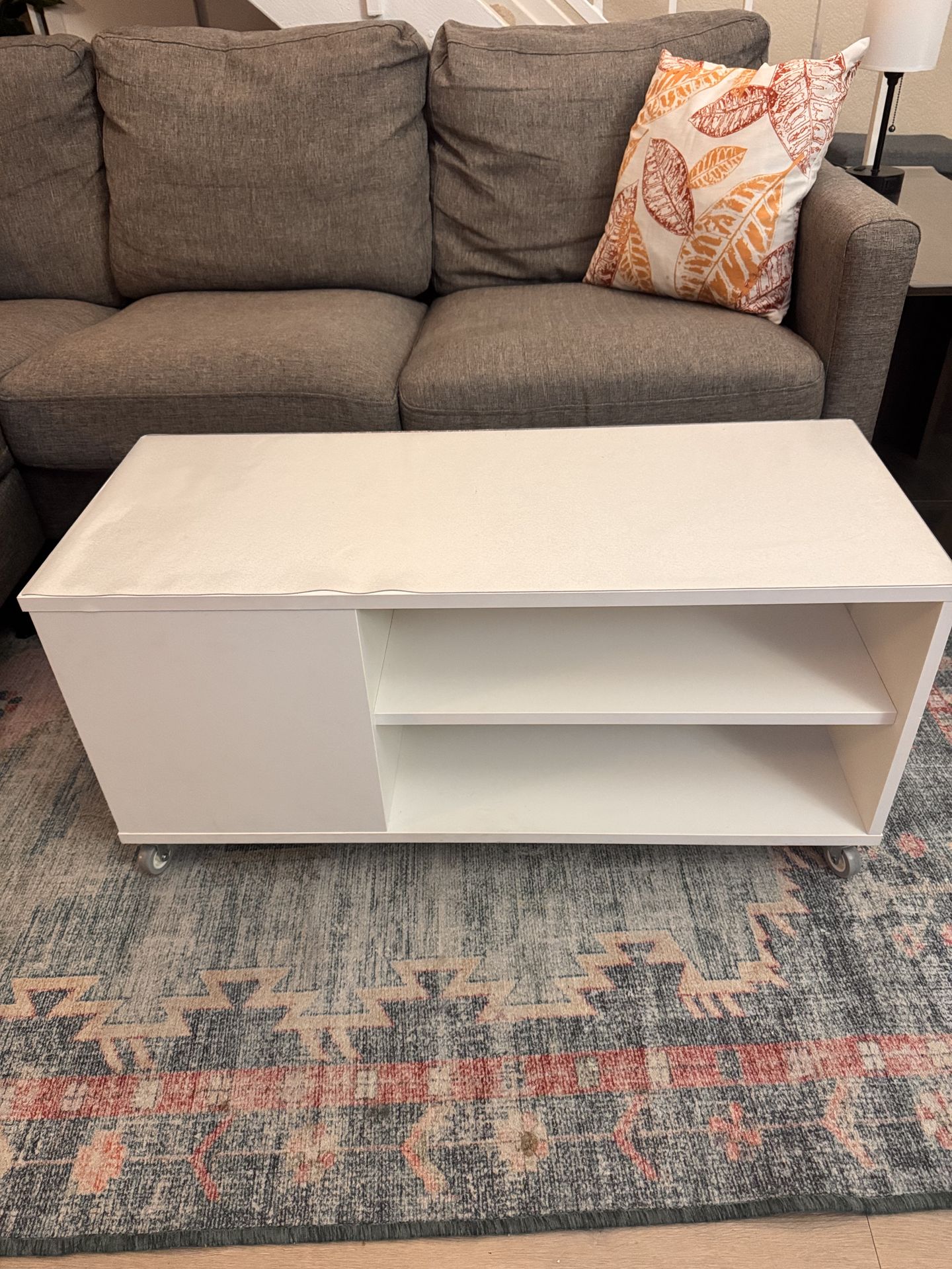 Great condition Ikea coffee table with wheels, has nice storage. Dimensions in pictures. Comes with protective plastic top.