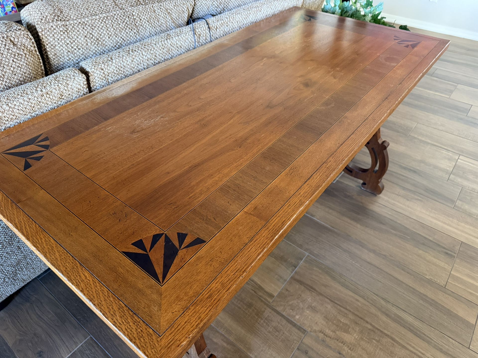 With inlay wood design on top, beautifully carved wood legs and unique iron accent. Size is 60” x 28”. Brand: Baker Furniture.