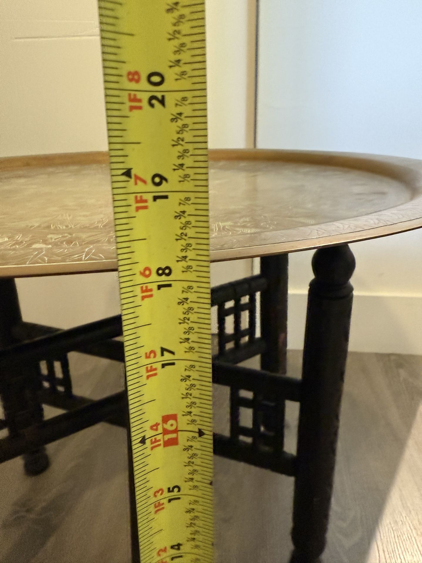 If you are reading this, the item is available and waiting for the right person to get it. Please read the whole post. Absolutely beautiful accent, end or coffee table. Amazing brass tray top Foldable base for easy storage Can stay as a permanent table or taken out of storage and use on demand Nice carved wood base in black Measurements in the pictures Pick up in Sunrise 33351 No holds unless a deposit is sent through Zelle Please check my other posts. Thanks for stopping by