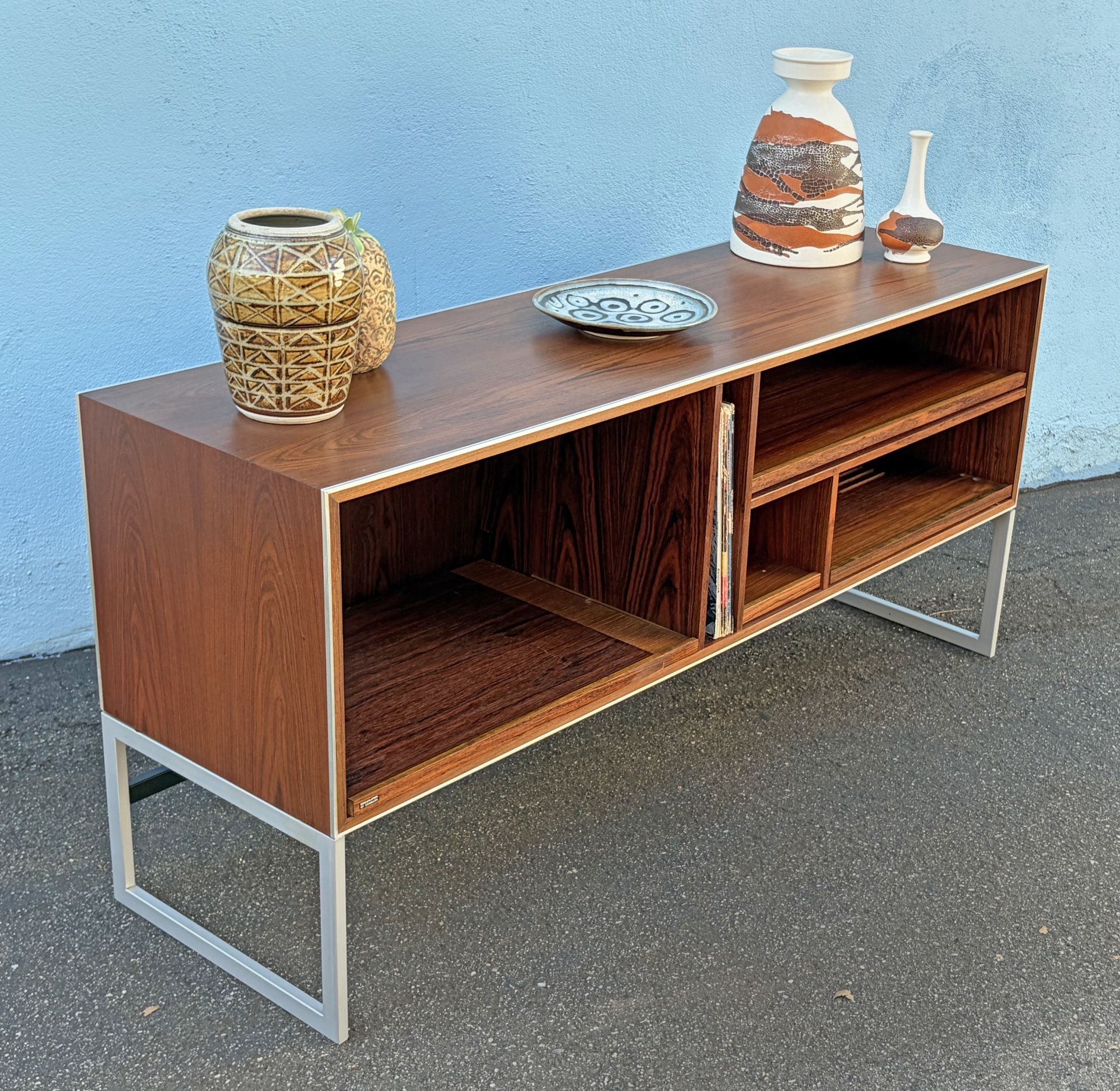 1970's Bang & Olufsen MC40 rosewood media cabinet. 16"x54"x25"h. Designed by Jacob Jensen. Good condition. No stains or chips. Nice brushed metal trim with tubular metal base. Metal base is a separate piece. Has sliding shelves for stereo equipment and a spot for records. One shelf is slotted for airflow. Has holes for cords in the back and bottom. Been reconfigured a little but well done. Clean and classy with the Bang and Olufsen label on the front.