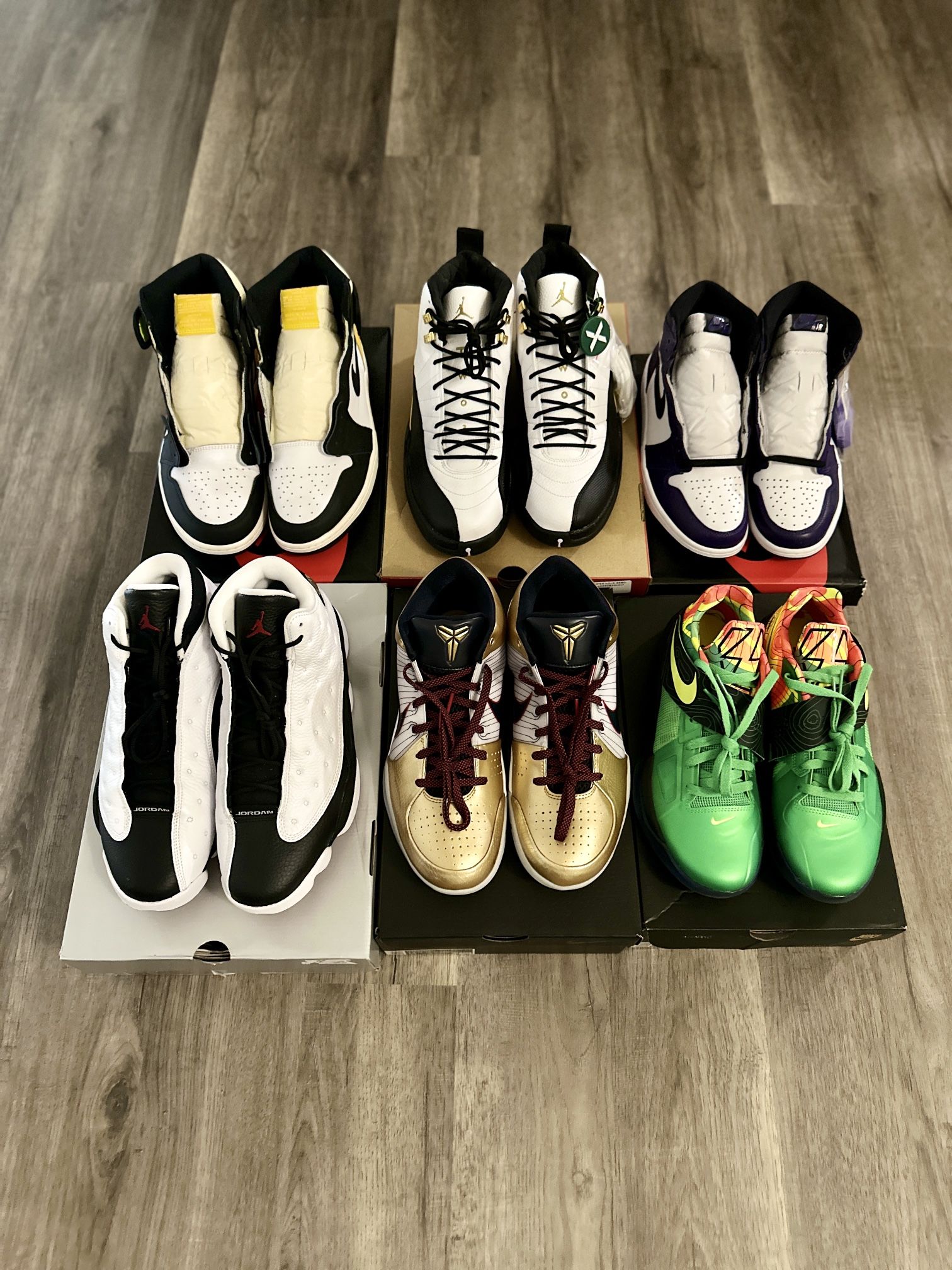 Nike Air Jordan 13 "He Got Game 2018" Size 12 $320 Nike Kobe 4 "Gold Medal 2024" Size 11.5 $250 Nike KD 4 "Weatherman 2024" Size 9 $160 Nike Air Jordan 1 "Volt Gold" Size 13 $110 Nike Air Jordan 12 "Royalty Taxi" Size 13 $240 Nike Air Jordan 1 "Court Purple" Size 9 $200 DM To Purchase Or Trade