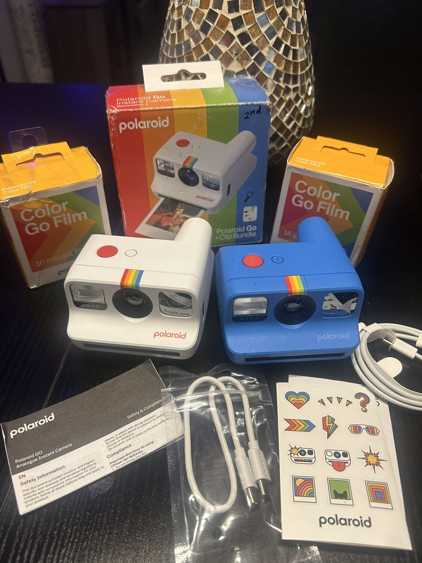 Polaroid Go Generation 2 - Mini Instant Film Camera BIG BUNDLE- Blue & White LIKE NEW CONDITION COMES WITH (2) BOXES OF 16 instant Film, only one film used to full test the unit! Total of (31) Films ready for capture! Comes with USB-C Chargers, Manual, Stickers & (2) Polaroid Go Cameras Asking for $120 FIRM FIRM FIRM!!