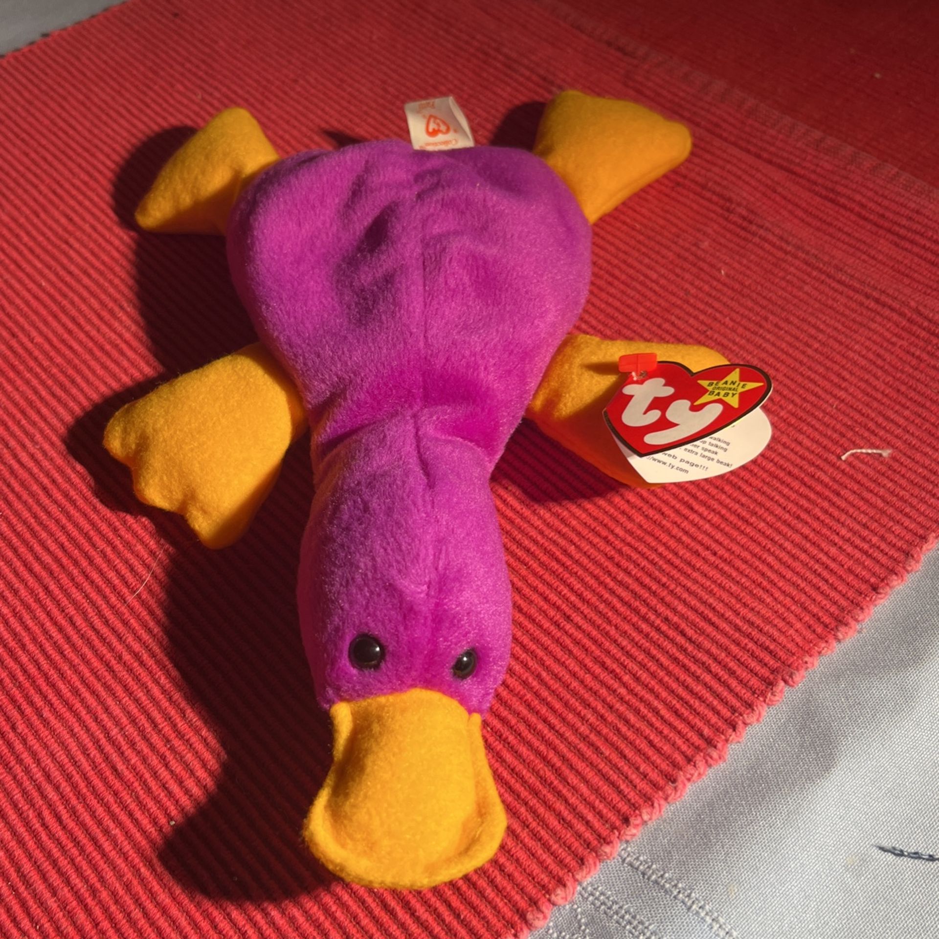 This fuchsia platypus has 4th generation swing and tush tags. She is one of the original nine beanie babies . Swing tag is missing comma’s, oakbrook is one word. The UK is missing. Birthdate is 1-6-93 and the style number 4025. The tush tag says 1993, made in China and has the desired PVC pellets. No comma and has the patent number at the base of the tag. This beanie baby is rare it’s vintage and it’s retired. All of our beanie babies were placed in plastic bags when we brought them home from the store and these bags were placed inside plastic bins for storage. The only time they were removed was to take pictures, We are a non-smoking household.