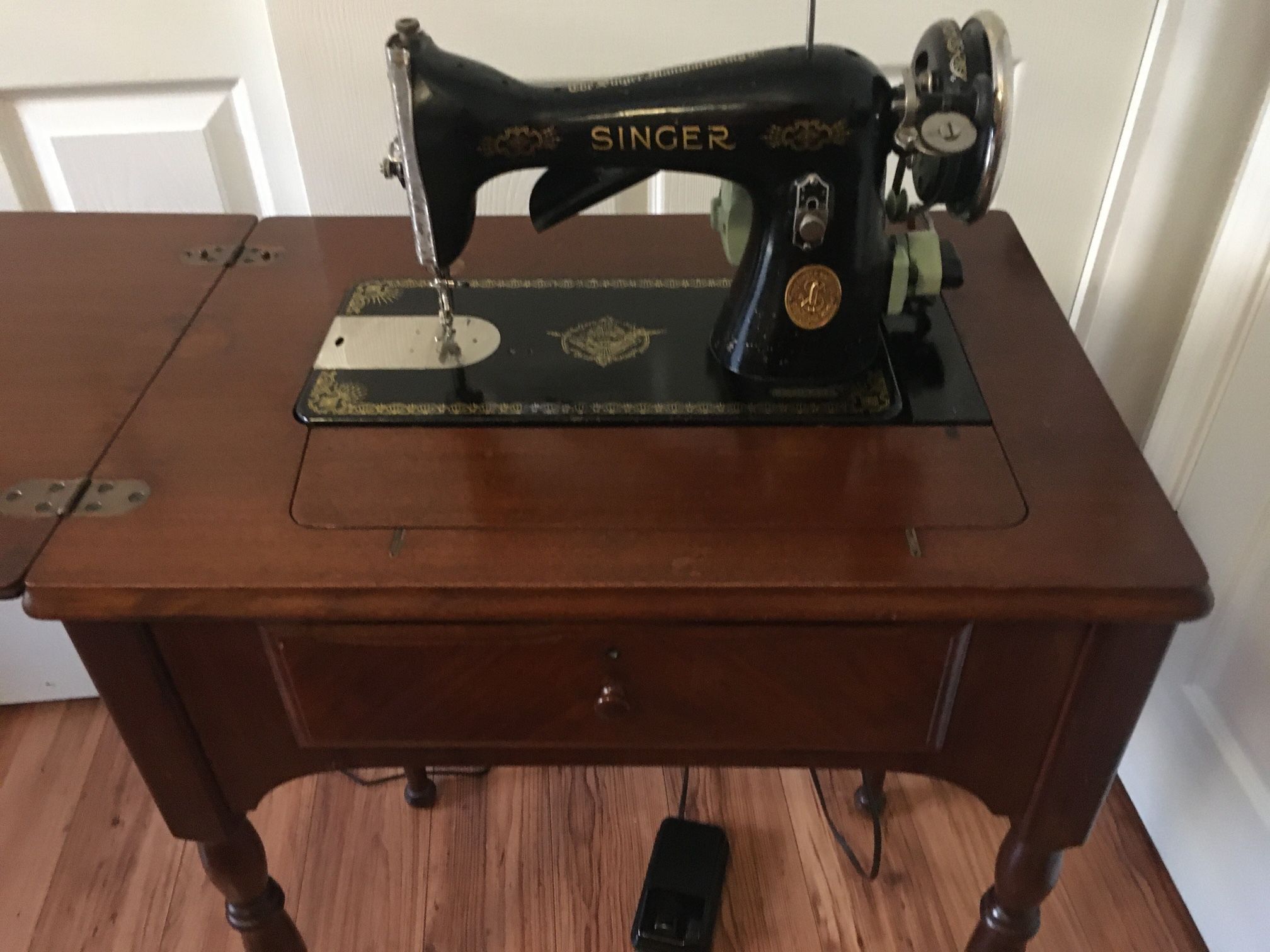 Vintage 1937 Singer Sewing Machine Model 15 with Singer foot pedal and new power cord. This beauty runs well. Model number is AE706946. Included is Singer sewing machine cabinet No. 50 with 88 years of character including an iron burn mark.
