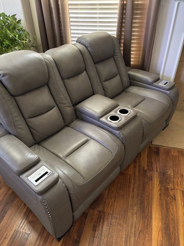 Grey leather recliner and phone charge love seat , couch, extra chair they all recline and is in perfect condition $2000
