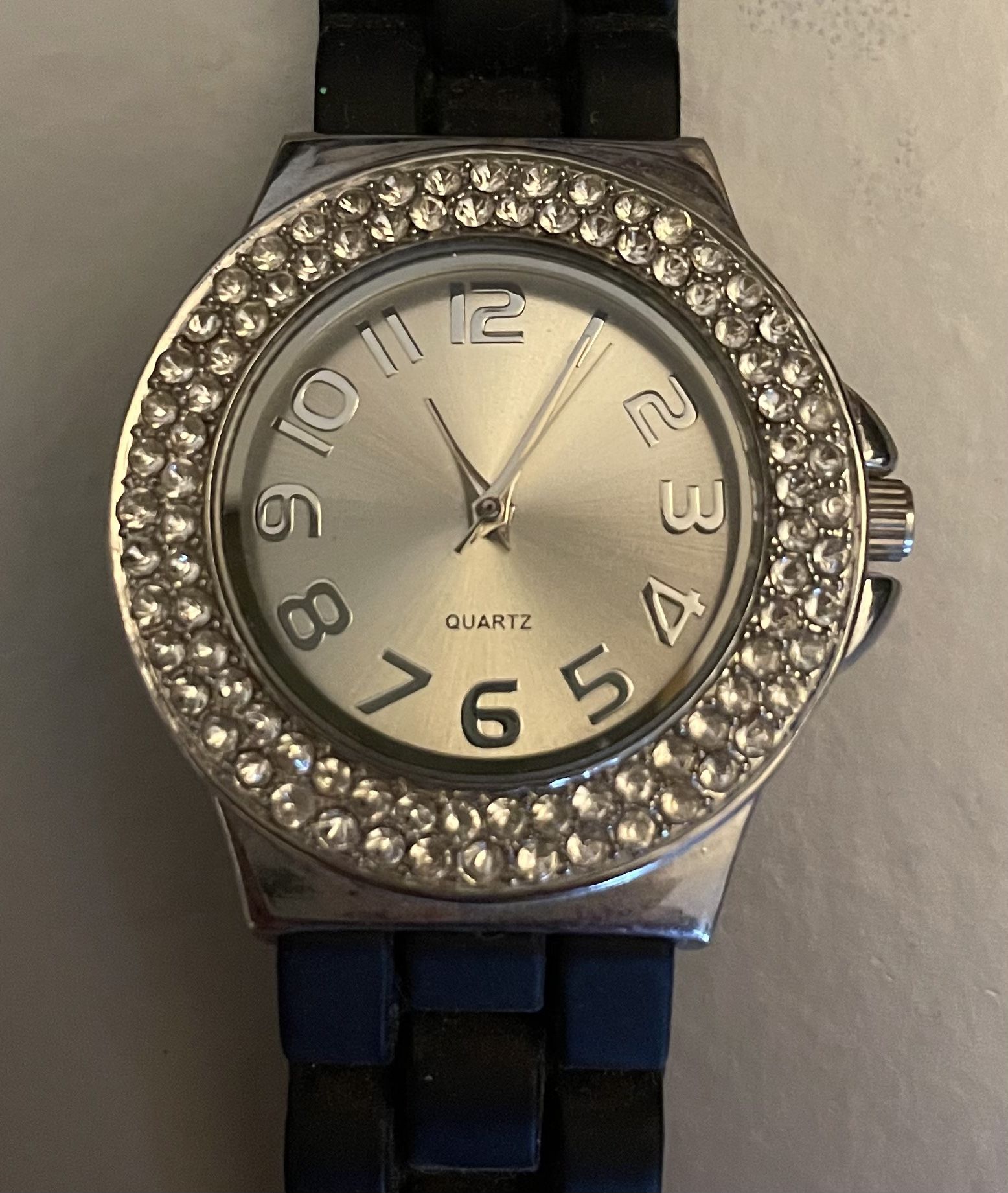Quartz Womens Watch. Silver tone with crystals. Black rubber band. New. Needs battery.
