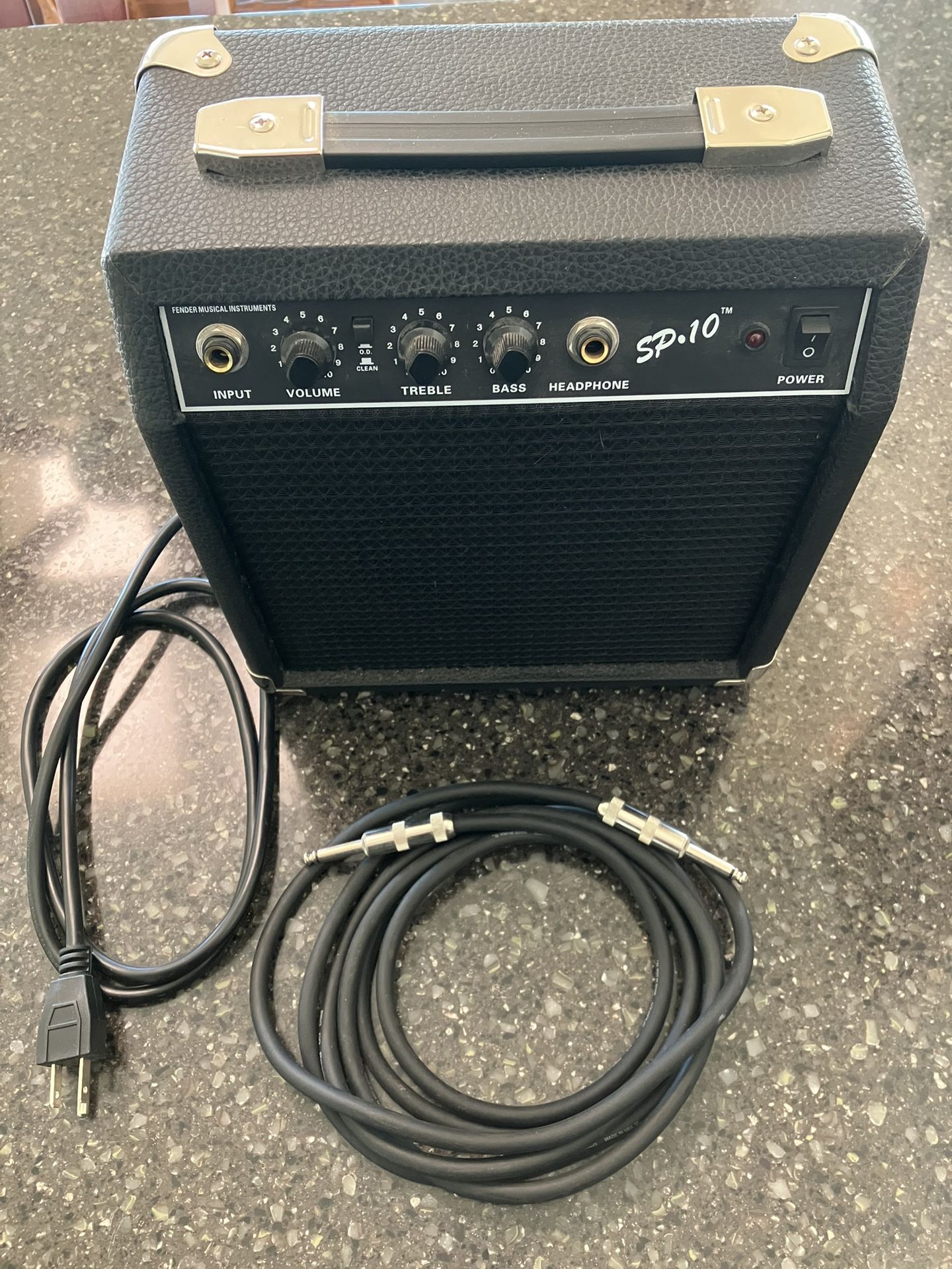 Fender SP 10 electric guitar amp with guitar to amp cord. Works great clean. Has head phone jack.