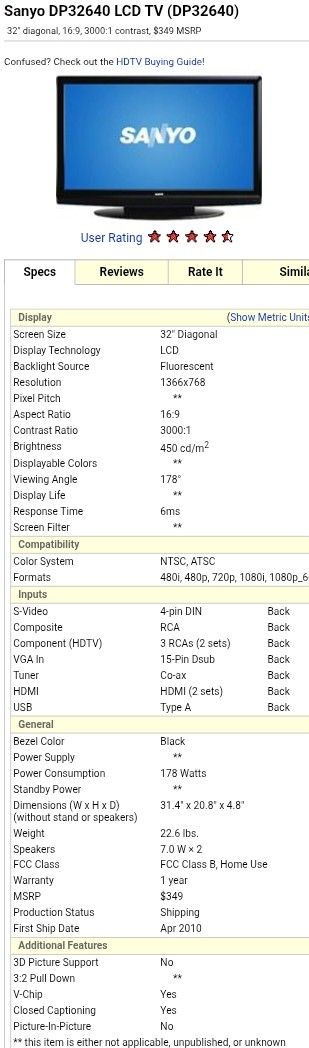 DP32640 HDTV LCD with integrated OTA tuners (both ATSC Digital and NTSC Analog) tuners in case you want free TV programming without any cable or internet hookups. for the digital age. This old-school "picture frame" design has gone out of style, but it PROTECTS THE SCREEN. (Think about how many cracked TV screens you have seen. And what did they all have in common? Thin frames around the screen, or they were "frameless." The picture frame is an advantage, not a disadvantage!) If you do have devices ready to connect, this HDTV has a full array of HDMI, Component Audio/Video, Composite Audio/Video and RF inputs, so you have plenty of options for DVD, VCR, Cable, Satellite and external antenna hookups. A coaxial digital audio output allows hookup to a home entertainment receiver amplifier system for theater like sound. The PC (VGA) input permits alternative use as a PC monitor while the USB input and Photo Viewer feature allows display of your digital camera photos for all to easily see. With a thin space saving design and small footprint, it can be positioned anywhere. The detachable pedestal base stand allows it to be wall mounted with an optional wall mount kit (not included).
