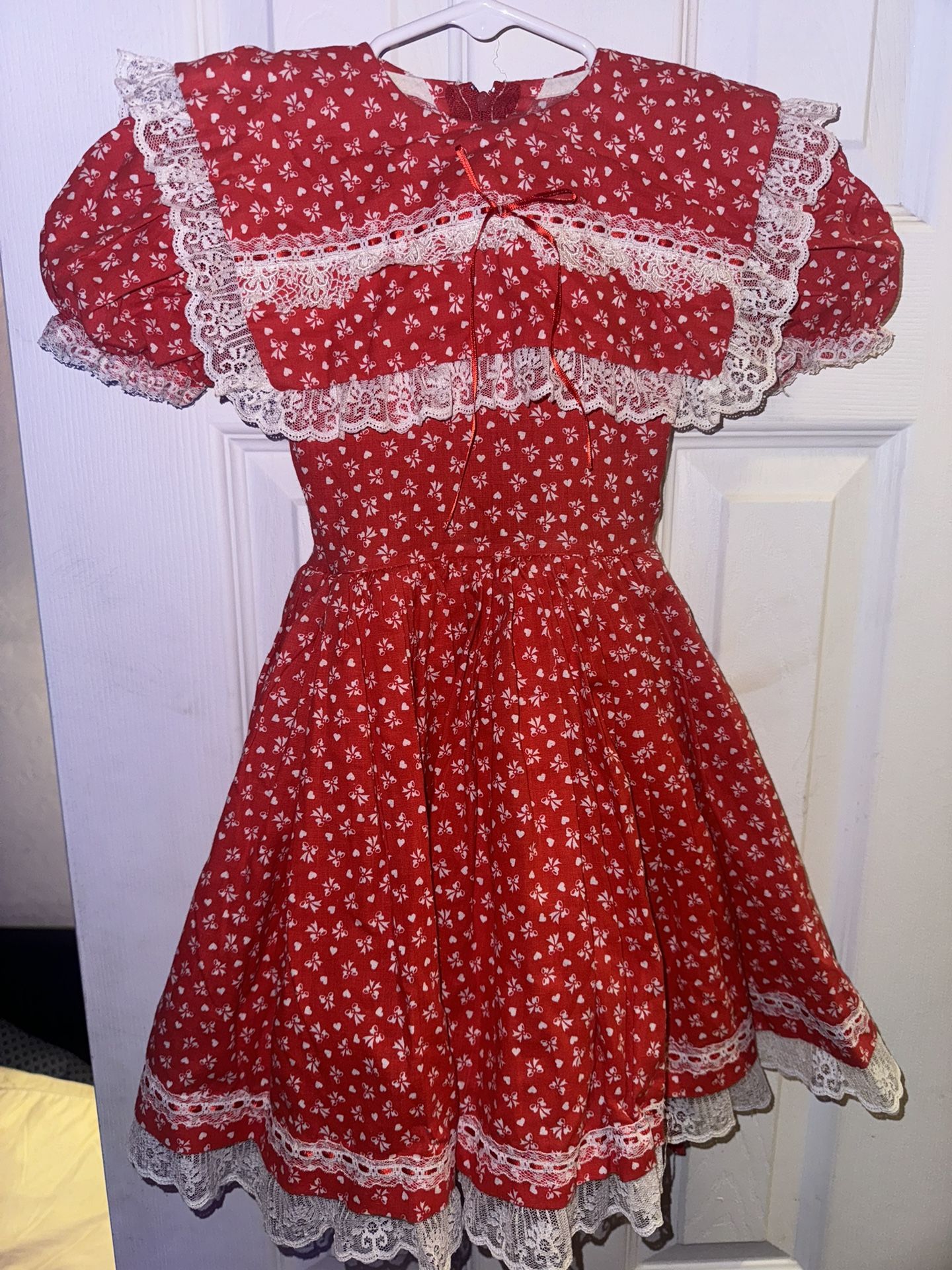 Vintage Valentine style little girl dress has bows and hearts on it very cute parry dress. I think it may be a size 6,7 or eight possibly or possibly a small medium for a little girl or doll