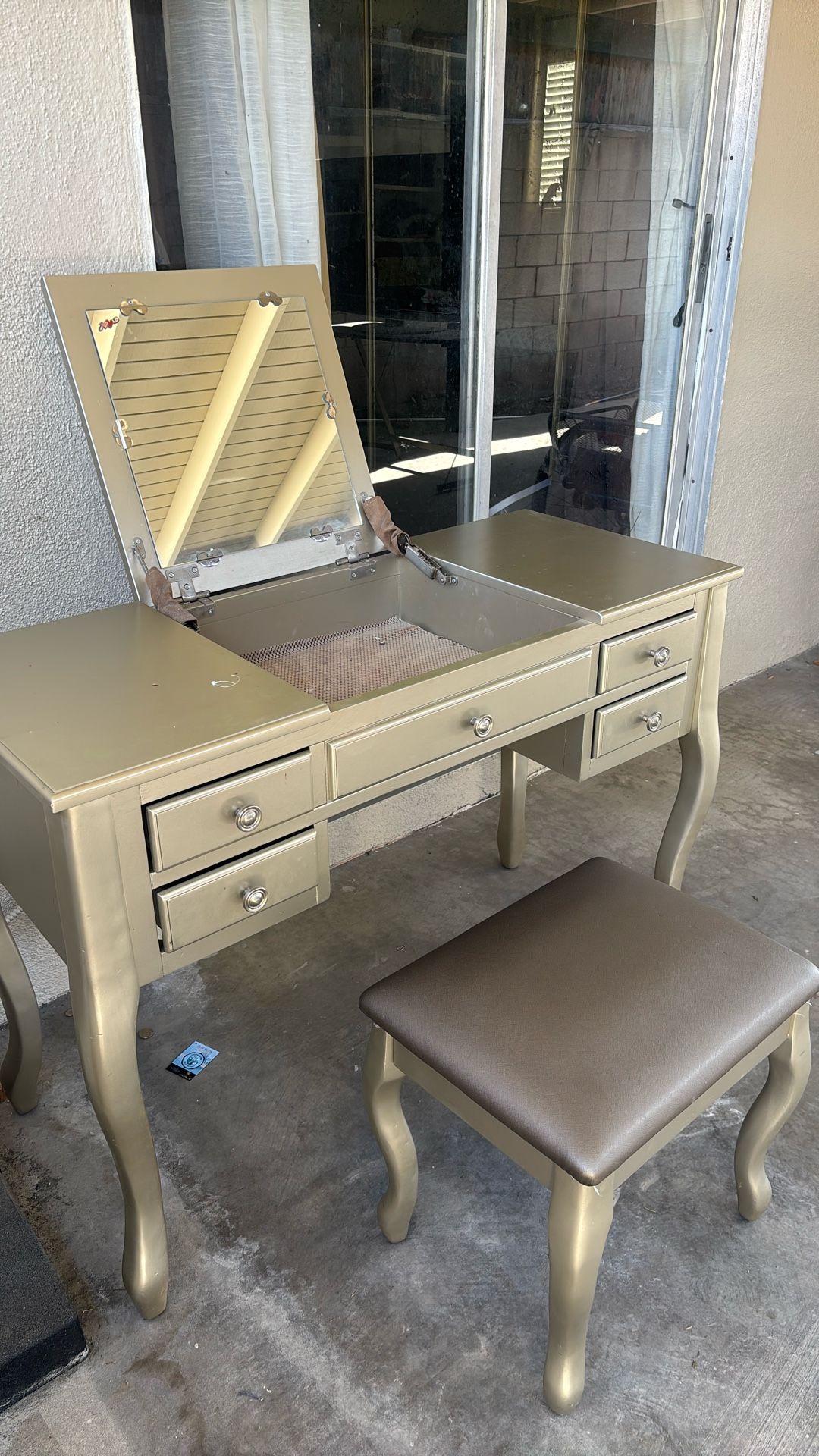 Vanity desk with seat,mirror and multiple drawers for storage. Great for makeup, getting ready, or as a small desk. Good condition and sturdy. Plenty of space for cosmetics and accessories. Message me if interested. (Bearly used)