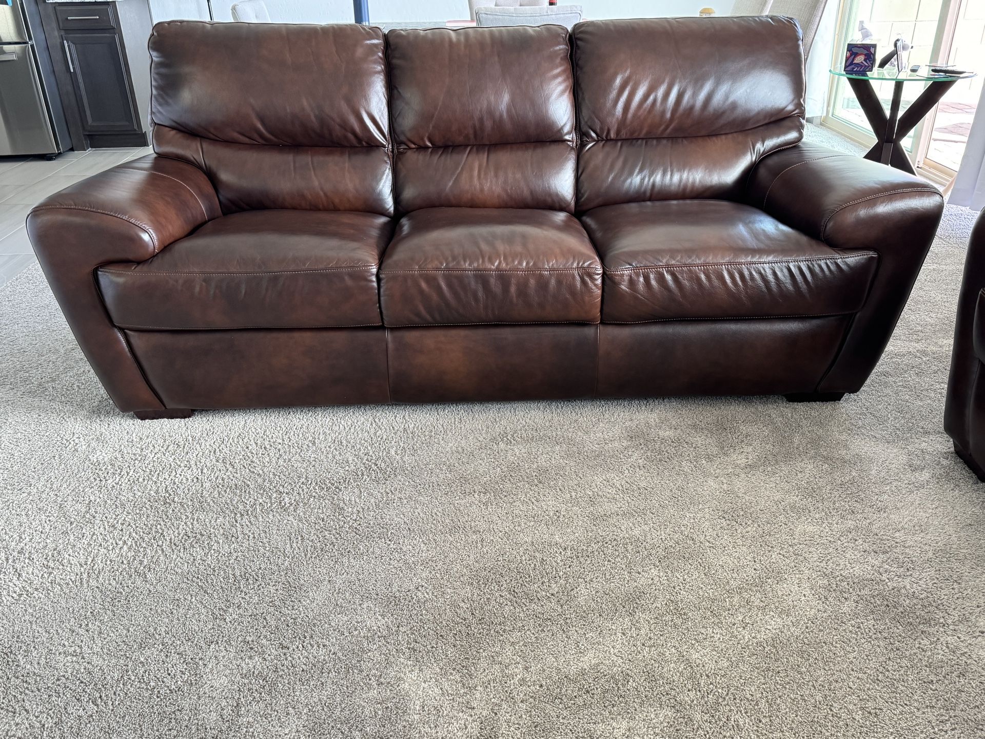 Selling only as a pair of two. Paid $2,755.00 for the pair and selling for $1,200.00 - less than two years old! 100% genuine belem leather matching couch set. Great condition. Wooden platform feet. High backs. Very comfortable. Backs are beautiful and can be exposed, no flaps. 1.5 years old. SMOKE FREE/PET FREE HOME! No spills, no cuts, no burns, no damage. 88 inch long x 36” deep x 37 inches tall from floor to highest point on the back of the sofa. Pick up near Red Rock Casino!
