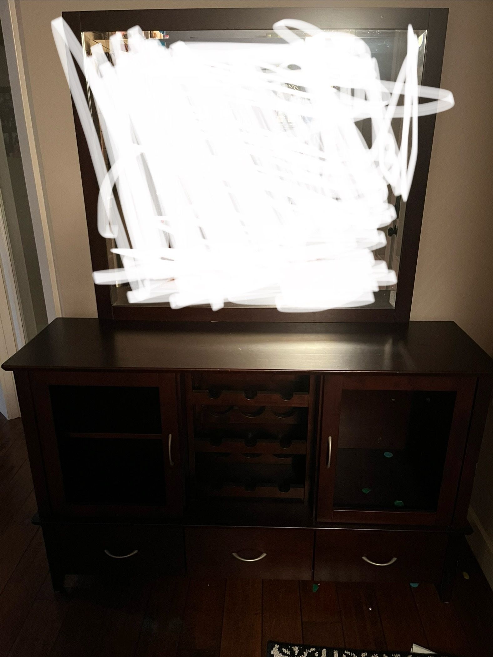 Buffet with mirror and wine rack. Cabinet doors did have glass but have been broken. 3 drawers on the bottom for storage