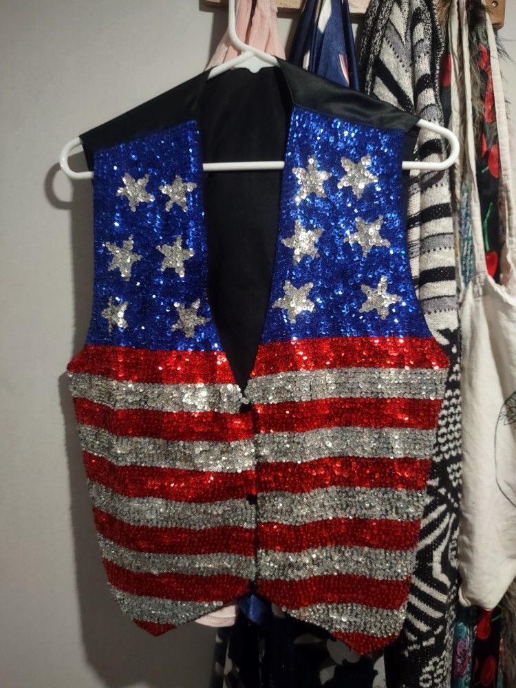 Amazing American flag sequin vest for sale. It wears like a Men's medium or large. It has a tie in the back to make it more fitted. I wore it for the 4th of July, but it's so amazing you could wear it to a rodeo, concert, a night out or anytime you want some sparkle in your life.