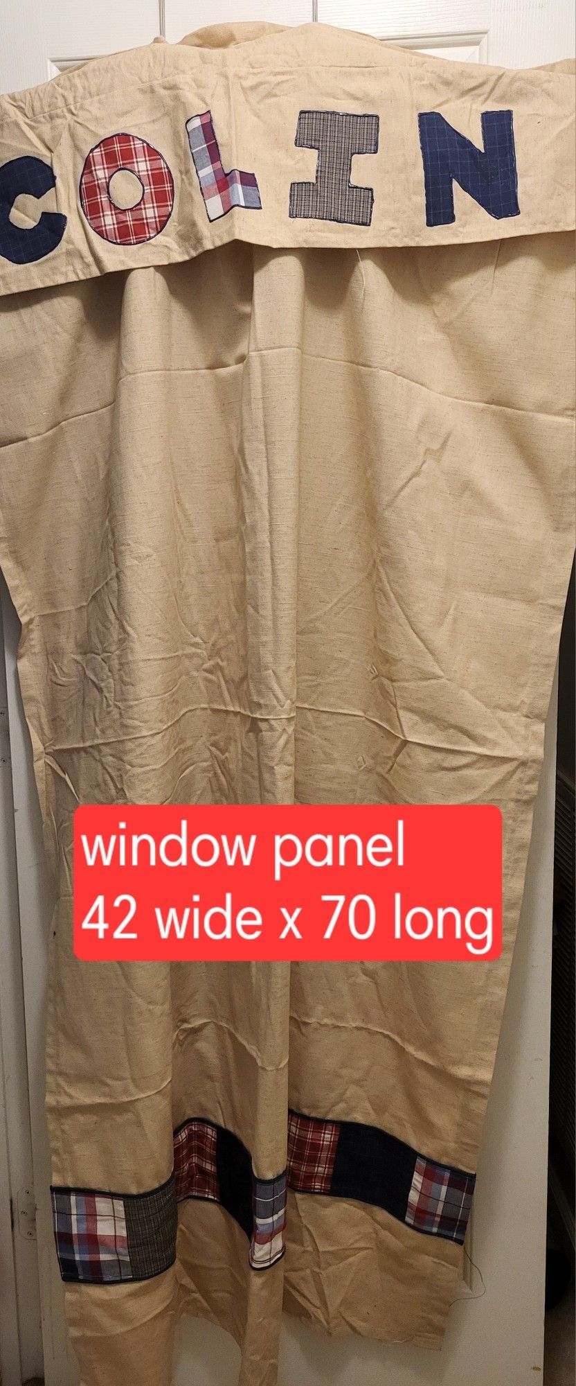 OPEN IMAGE FOR FULL PHOTO Window treatment is tan in color with navy plaid accents. I made this for my son's room but is no longer used. I am not a professional, but it is great looking when hanging. The dimensions are marked. The valance is 34 inches. The panel is approximately 42 in x 70 in